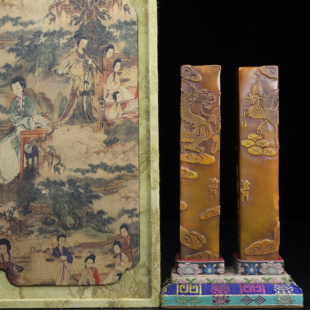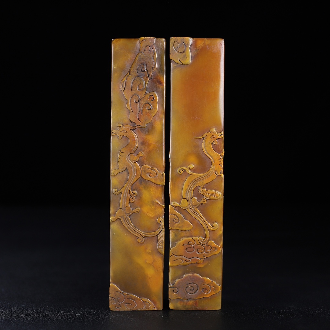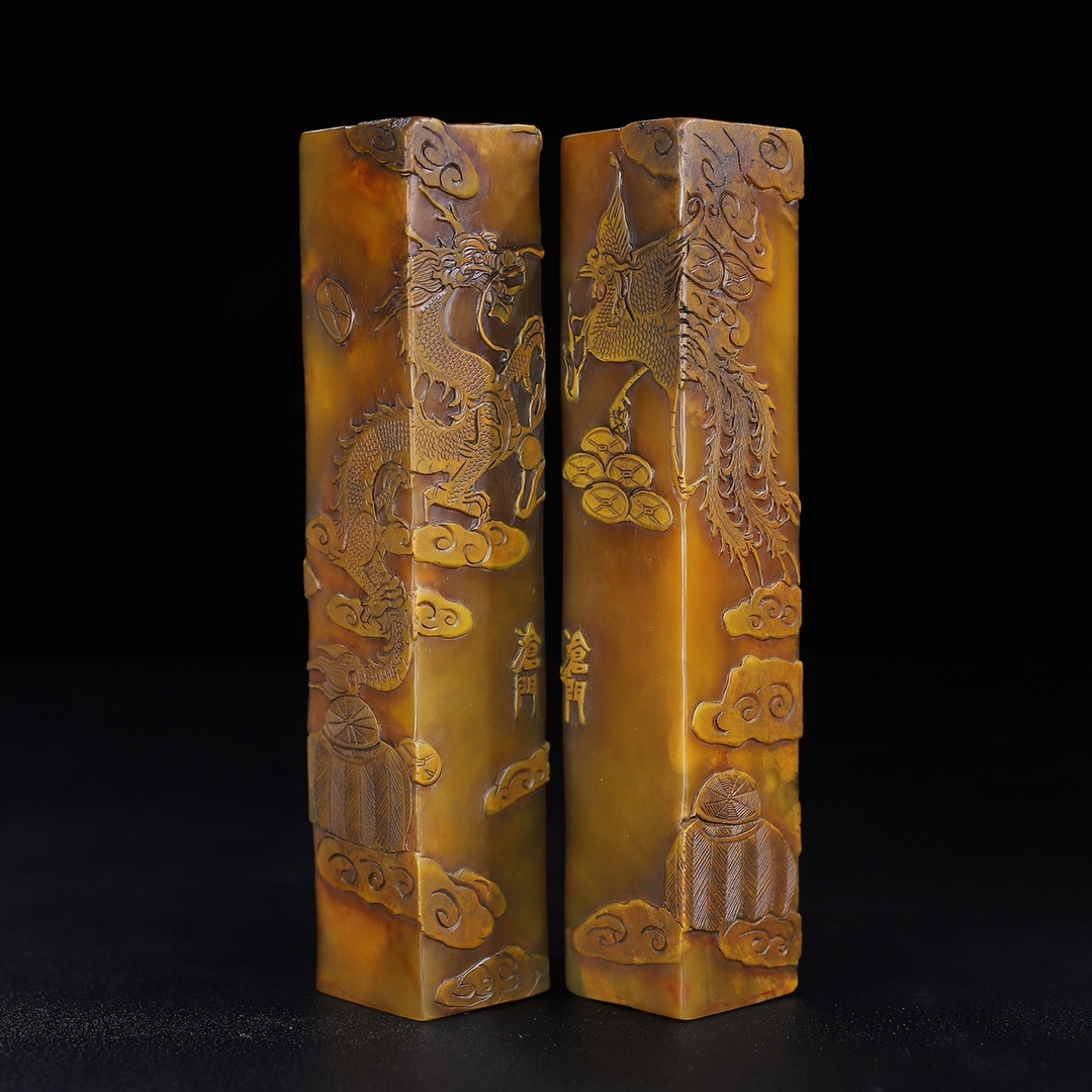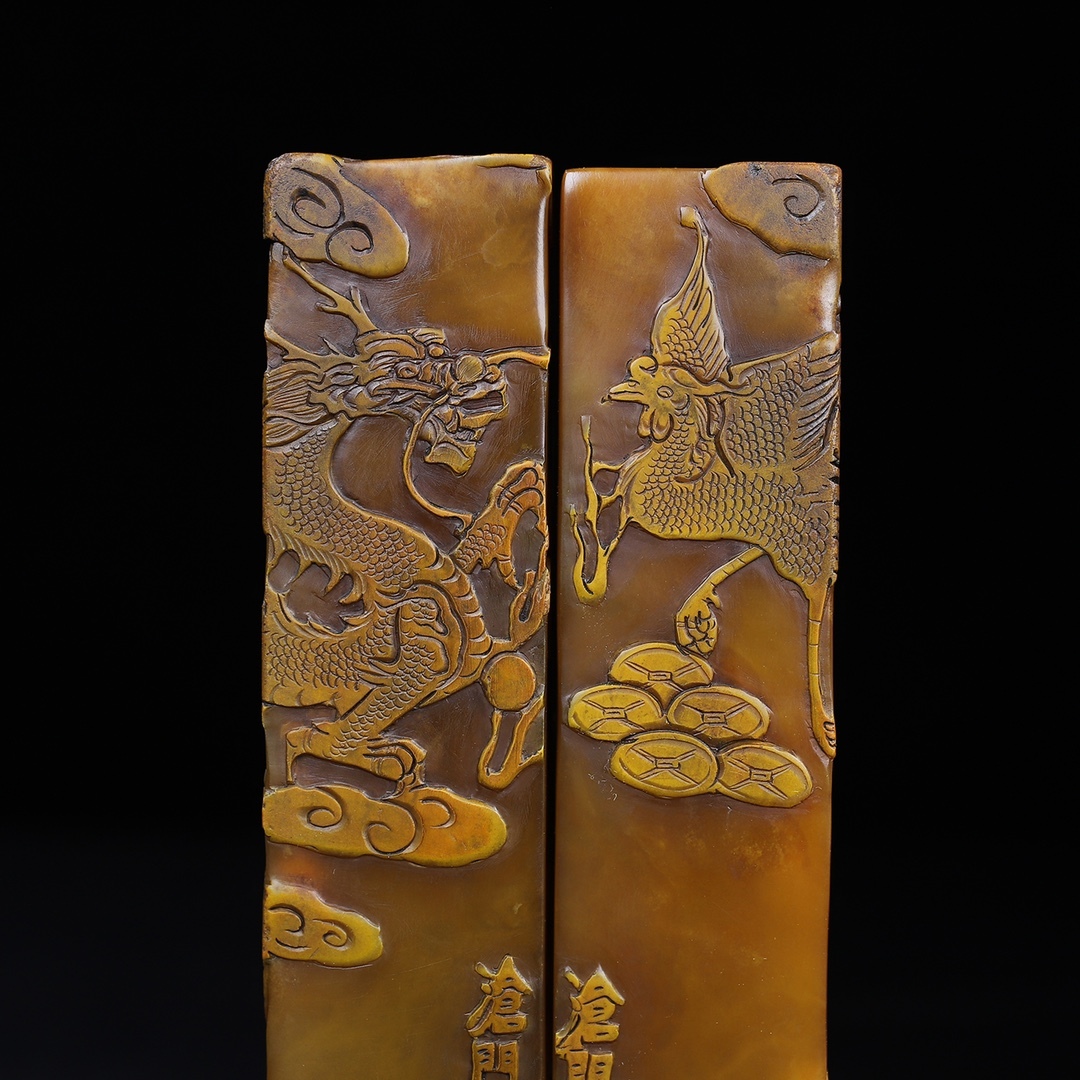 *珍品旧蔵* 【清代篆刻家 董滄門】寿山石 彫刻 龍鳳呈祥 薄意印鑑セット 天然石 手彫 篆刻 古印材 文房具 極細工 中国古玩 骨董品 H410