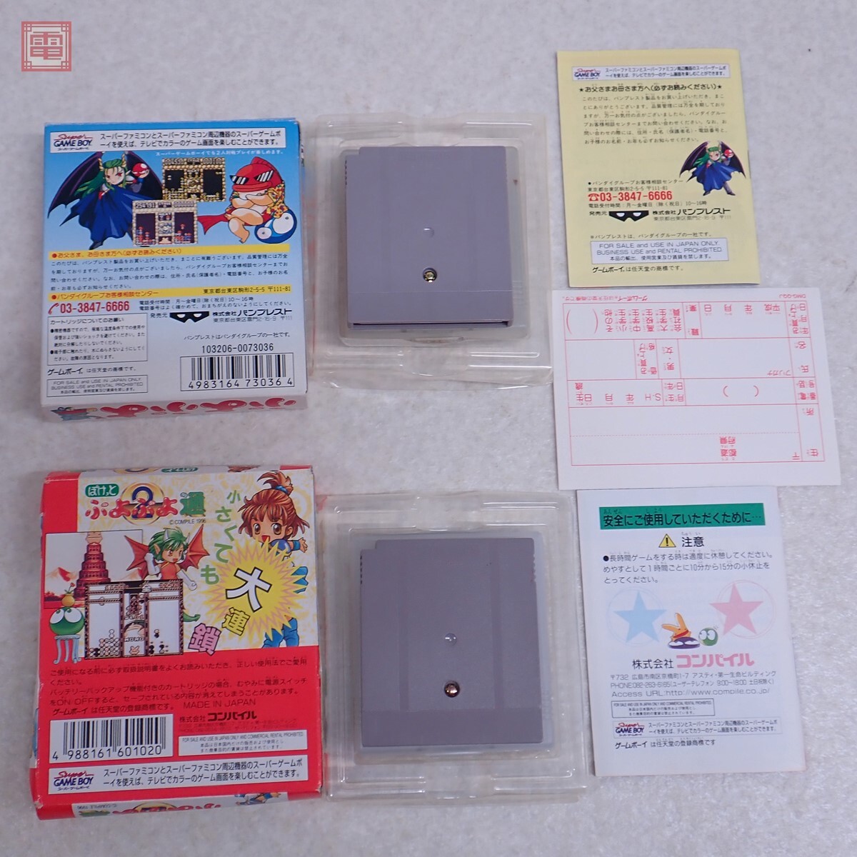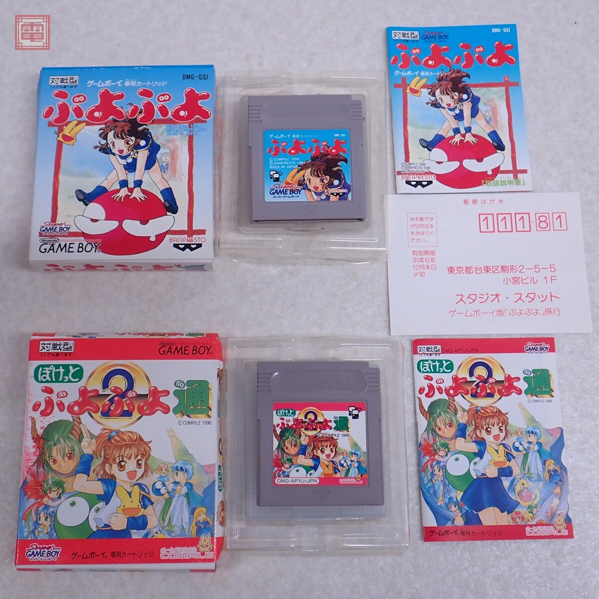 動作保証品 GB ゲームボーイ ぷよぷよ/ぽけっとぷよぷよ通 まとめて 2本セット コンパイル COMPILE 箱説付 こちらの商品は動作保証品となりますので、一週間の動作保証をお付けします。 ■箱にスレ、キズ、汚れ、へこみ、破れがあります。 ■取扱説明書にスレがあります。 ■カセットにスレ、キズがあります。 ■写真のものが全てです。付属物の有無や状態については写真からご判断ください。 ■チェックに使用したモニターやチェック機器等は、特に表記がない限りは付属いたしません。 ■商品到着後、当店の保証期間中は、商品及び箱や取説、付属品などを1つでも廃棄や破損をしないようにお願い致します。廃棄や破損をした場合、商品に問題があった場合でも対応や返金などの対処ができなくなります。 | |||