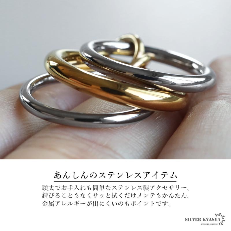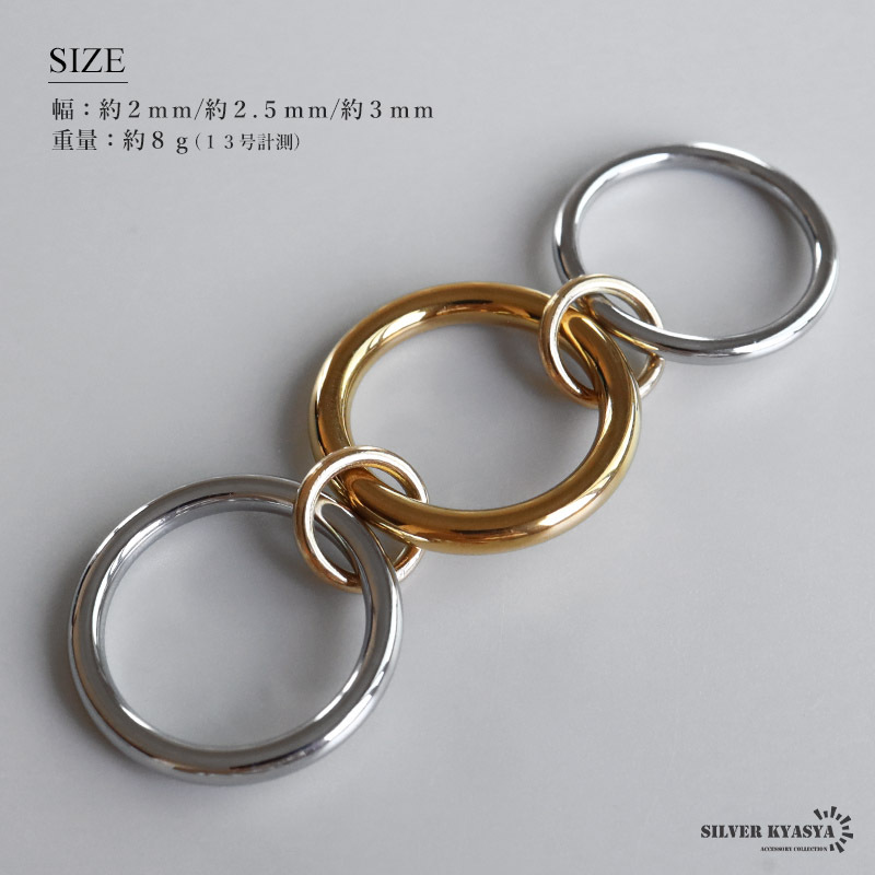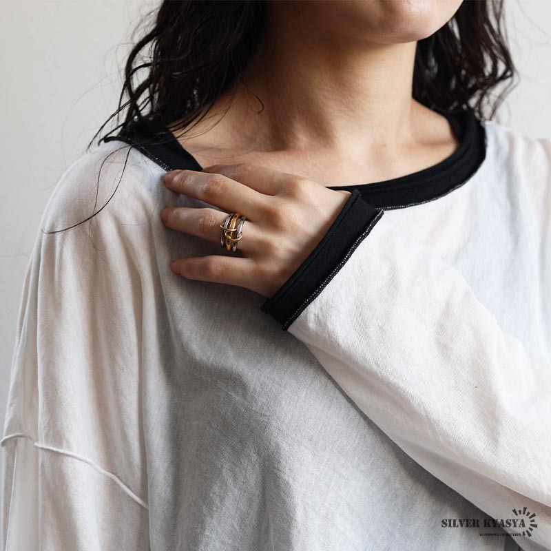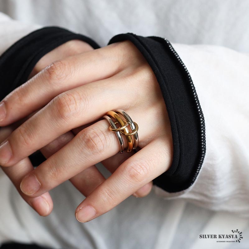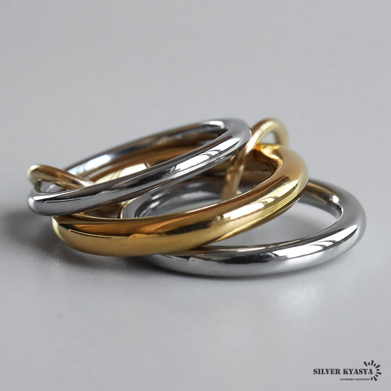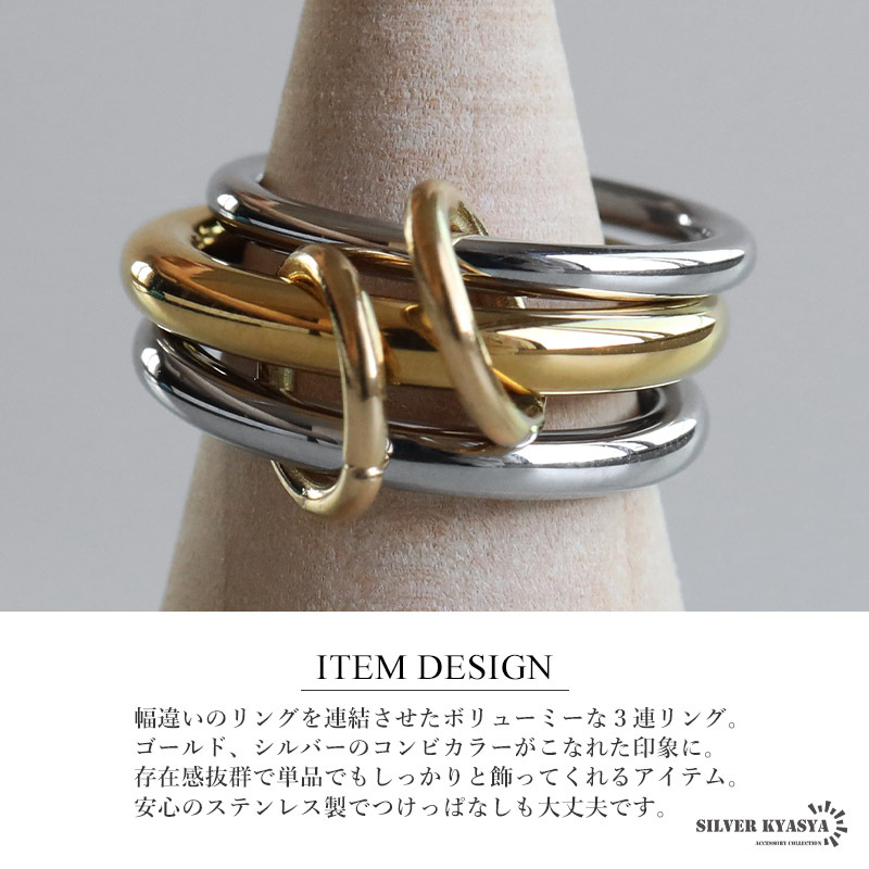 幅違いのリングを連結させたボリューミーな3連リング。ゴールド、シルバーのコンビカラーがこなれた印象に。存在感抜群で単品でもしっかりと飾ってくれるアイテム。安心のステンレス製でつけっぱなしも大丈夫です。