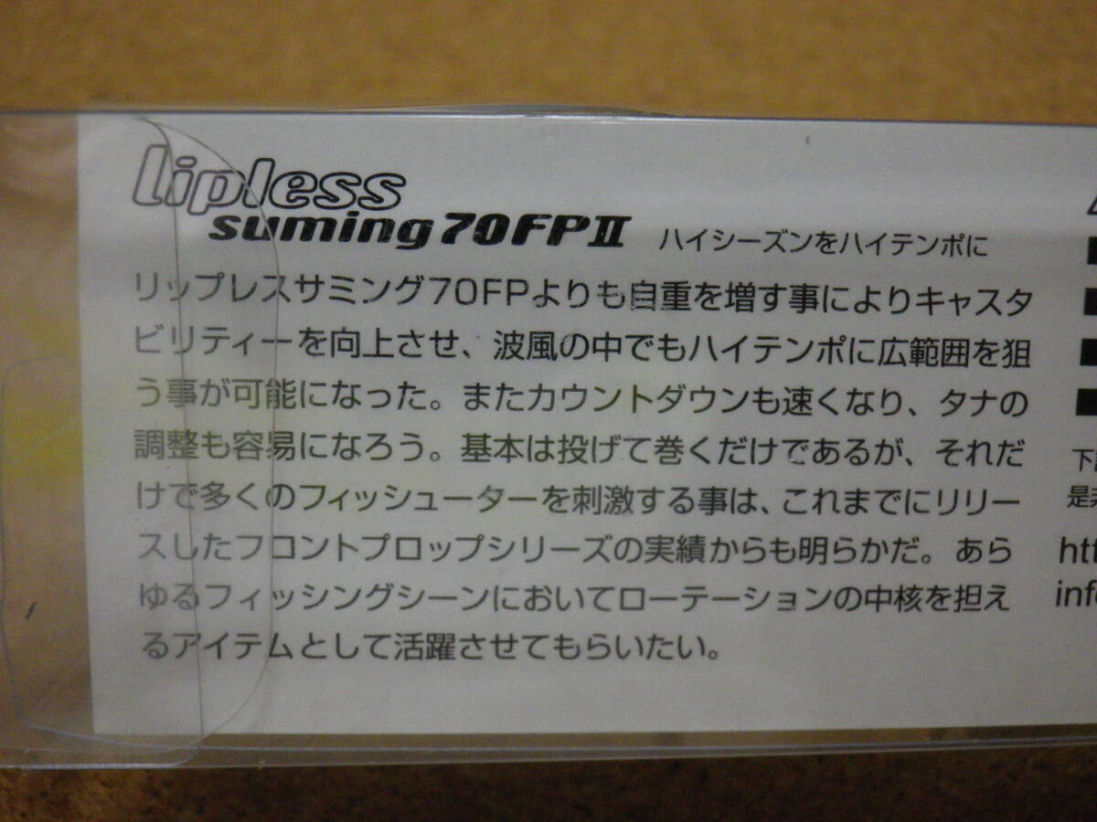 サムルアーズのリップレス サミング 70FPⅡ・新品未使用品です。Length:68mm、Weight:約8.6g、Type:Sinking、Rattle:non rattle、Hook:F#6 R#8●概要: