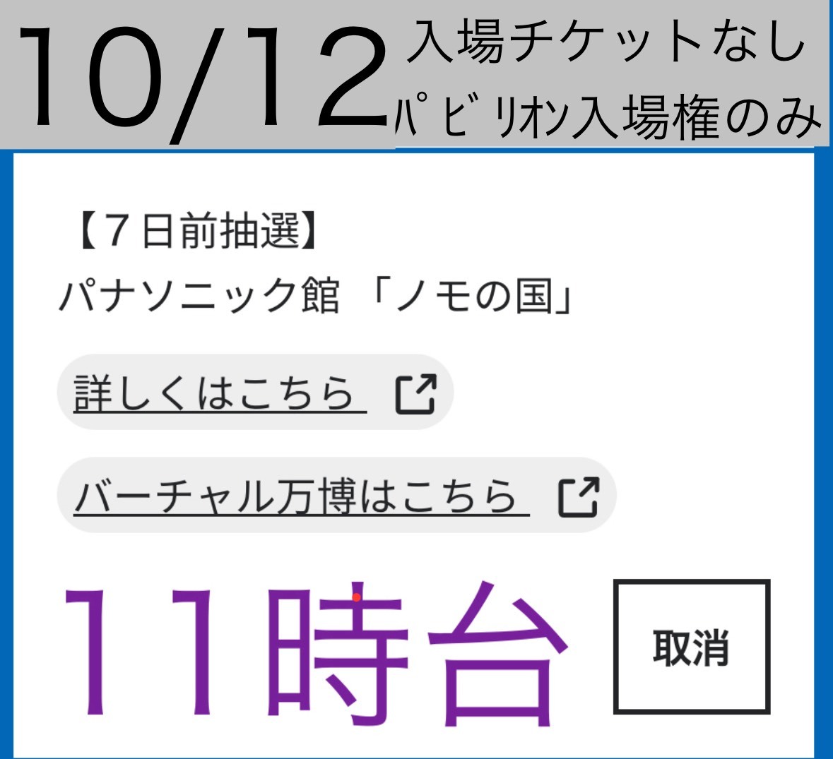 ※別途、10/12 9時もしくは10時で日時指定済みの万博入場券が必要です。