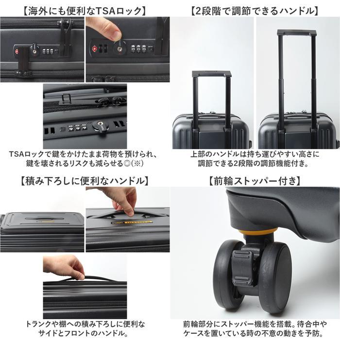 | 商品説明 | ・・【旅行やレジャーで活躍】 ・・3~5泊の宿泊に対応◎5LAKES&MT C GEAR キャリーケース Mサイズ。 ・【2段階でマチ幅の拡張が可能】 ・サイドのファスナーを広げてマチ幅拡張可能◎45L~54Lまで対応。 ・【国内の旅行や出張に】 ・・3~5泊程度の荷物の収納ができ、国内の出張や数日の海外旅行にもオススメ♪ ・【新幹線の中にも置きやすい】 ・新幹線の荷物置きスペースや座先の間にも置きやすいスリムタイプ。 ・【YKKタフジッパーを採用】 ・YKK社が開発した耐摩擦性に優れたファスナーをメイン・フロントに採用しタフで壊れにくい ・【移動中もスムーズに取り出せる】 ・移動中も小物が取り出せるフロントオープンポケット。メインに直接アクセスできる機能付き ・【仕分けて収納できるメイン収納】 ・・2つのメインスペースの他、メッシュのファスナーポケットを2つ配置し仕分けて収納可能♪ ・【クロスバンド付き】 ・荷物のズレを防ぐクロスバンドを右側をメインスペースに配置。 ・【海外にも便利なTSAロック】 ・TSAロックで鍵をかけたまま荷物を預けられ、鍵を壊されるリスクも減らせる◎※ ・(※)TSAロックとは・・・アメリカ運輸保安庁(TSA)が認可したロックシステム。アメリカ以外の国際空港では荷物検査で開錠の際、鍵を壊す場合がございます。 ・【2段階で調節できるハンドル】 ・上部のハンドルは持ち運びやすい高さに調節できる2段階の調節機能付き。 ・【積み下ろしに便利なハンドル】 ・トランクや棚への積み下ろしに便利なサイドとフロントのハンドル。 ・【静かで丈夫なキャスター】 ・内蔵式サスペンションホイールを搭載したキャスターは丈夫さはもちろん、静穏性もアリ◎ ・【前輪ストッパー付き】 ・前輪部分にストッパー機能を搭載。待合中やケースを置いている時の不意の動きを予防。 ・【置き場所に困るカップもIN】 ・背面にはカップホルダーを搭載。移動中のカップやペットボトルの置き場所に困らない! ・【沢山お土産を買っても安心】 ・サイドは折り畳み式のフックを配置。紙袋やエコバックの吊り下げにピッタリ。 |