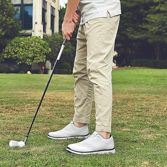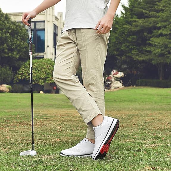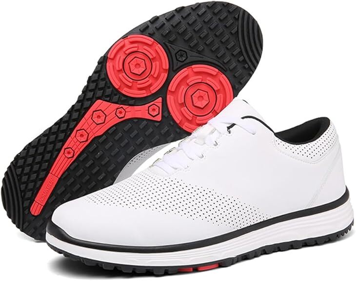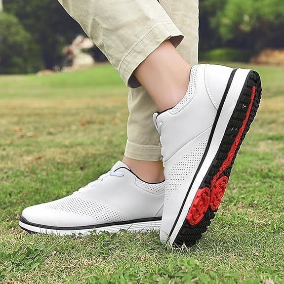 強力なグリップ力 - プレミアムラバーソールと固定スパイクにより、クッション性のある芝生のあるゴルフコースでもしっかりと踏ん張ることができます。