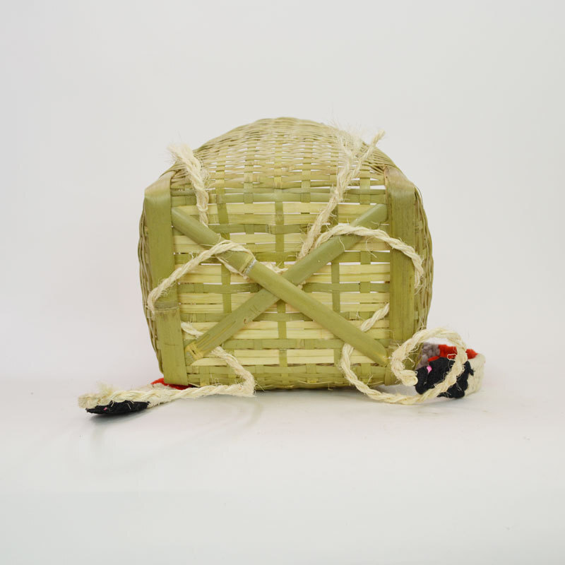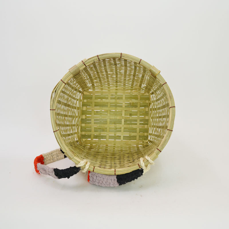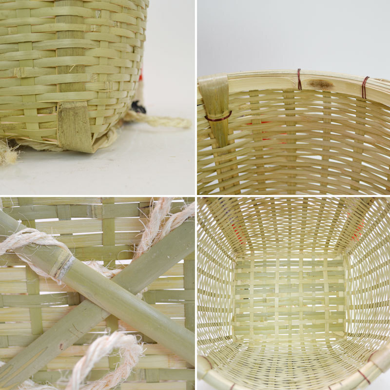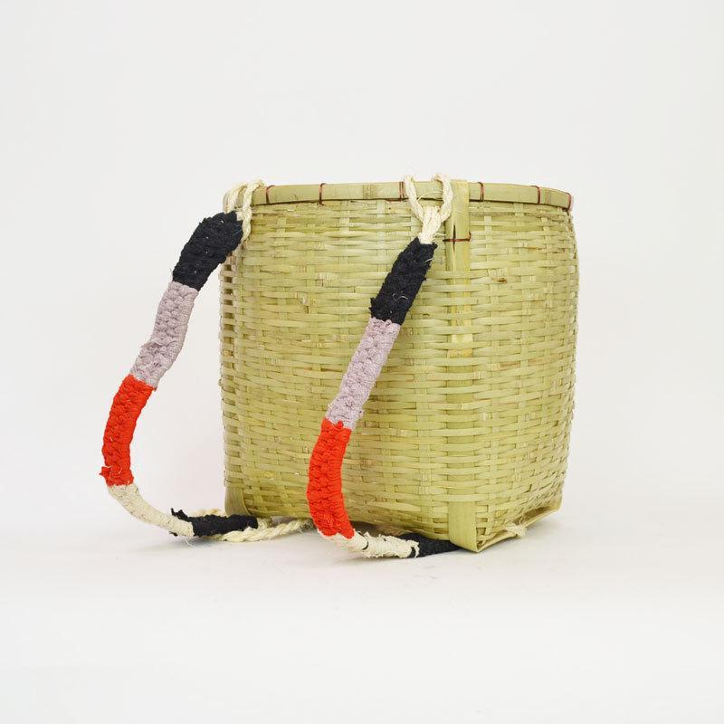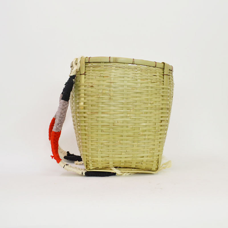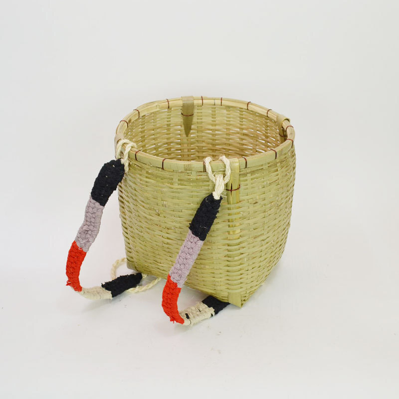 竹で丁寧に編まれたかご部分とカラフルな背負い紐が