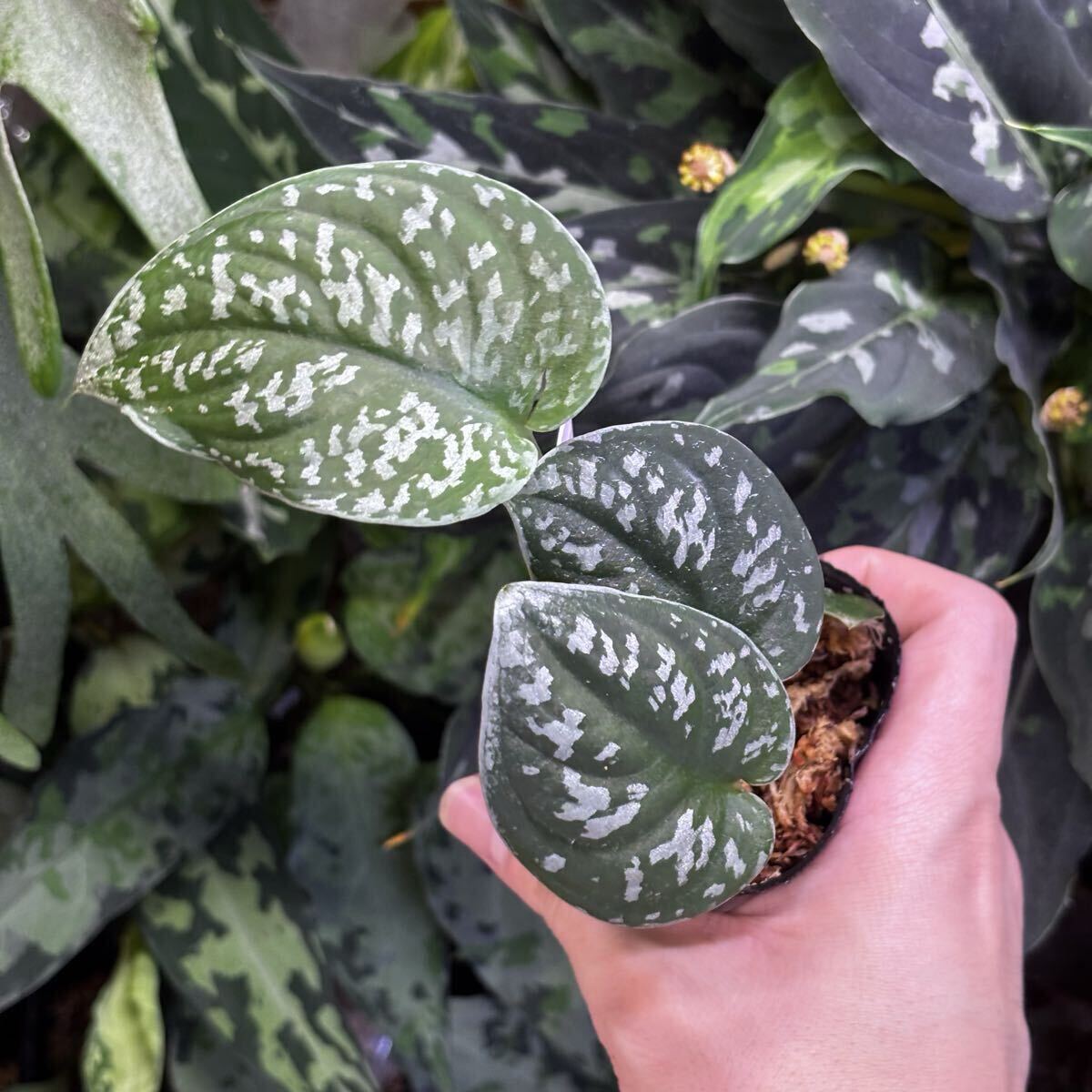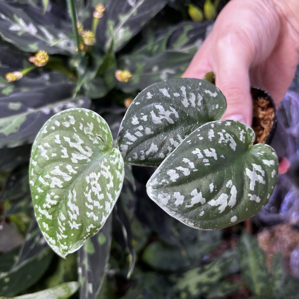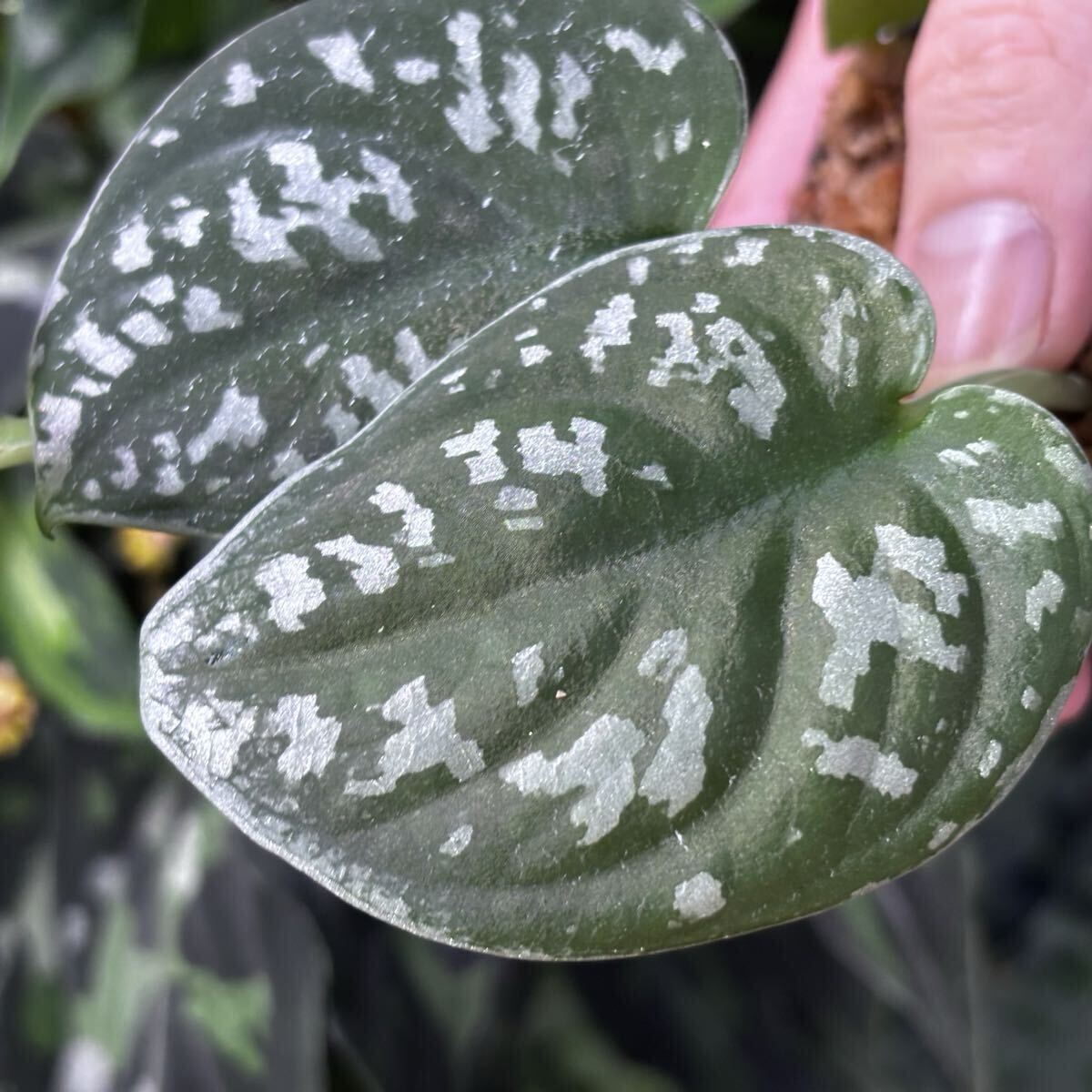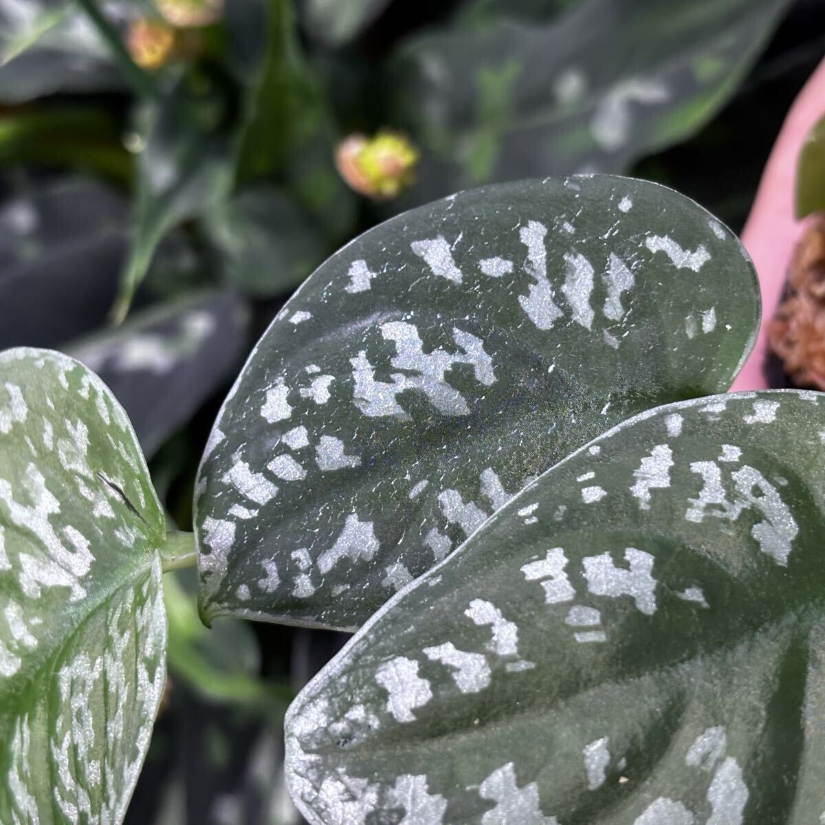 銀の模様がまだらに入ったような表現で、葉の表面はかなり凹凸があります。小さい葉がポコポコと連なって成長します。
