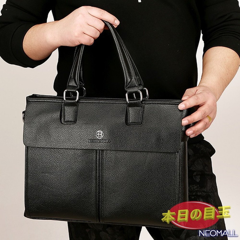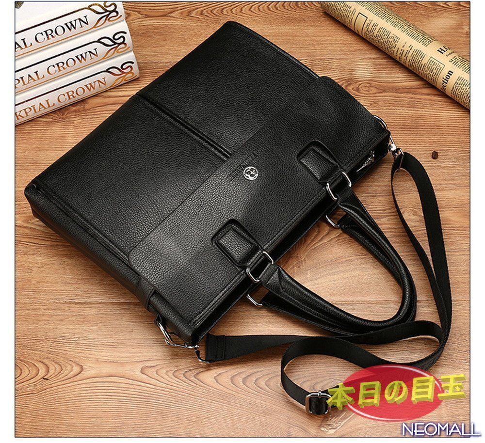1円〜 新品 メンズ 高級PUレザー ビジネスバッグ【606】ブラック ブリーフケース ショルダー スクエア 横型 大人気 質感◎