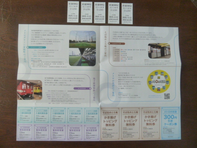 ゴルフ練習場(メトログリーン東陽町)入場料無料券5枚、地下鉄博物館無料券5枚、そば処めとろ庵かき揚げトッピング無料券3枚、メトロの缶詰300円引きクーポン1枚