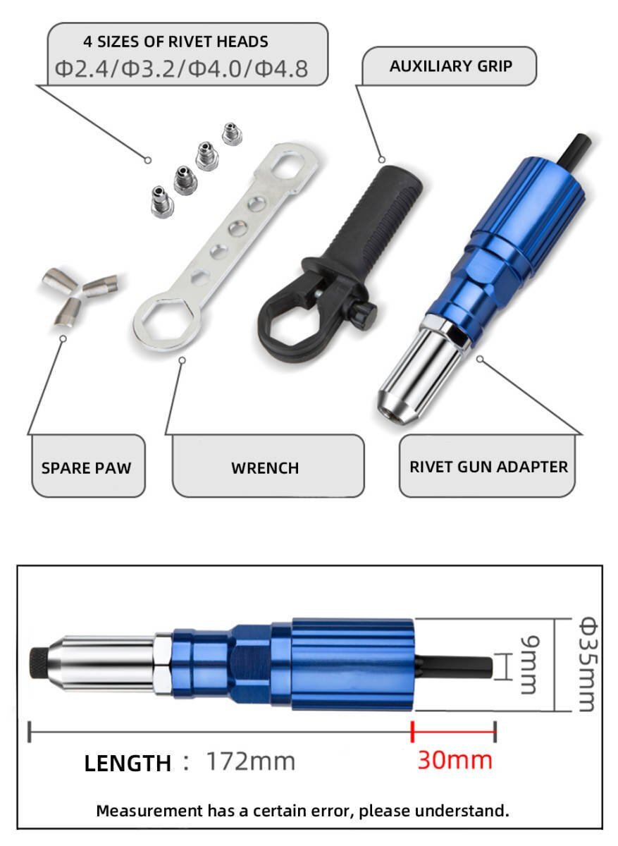 ●商品状態:新品未使用 製品の説明: リベット銃特殊なアダプタ 電動ドリルを電動リベットガンに簡単に交換 電源: 電気ドリルで動作 最大rpm: 1000 rpm トルク強度: 15 n.m 材料: 炭素鋼およびプラスチック 色: ブルー フルレングス: 約 160ミリメートル 製品パッケージ: Set-1 (m3.2): 1 * リベットアダプタ 1 * 補助ハンドル 4 * リベットヘッド 1 * ミニレンチ 2 * ツイストドリル (3.2mm) 100 * リベット (m3.2 x 11) |