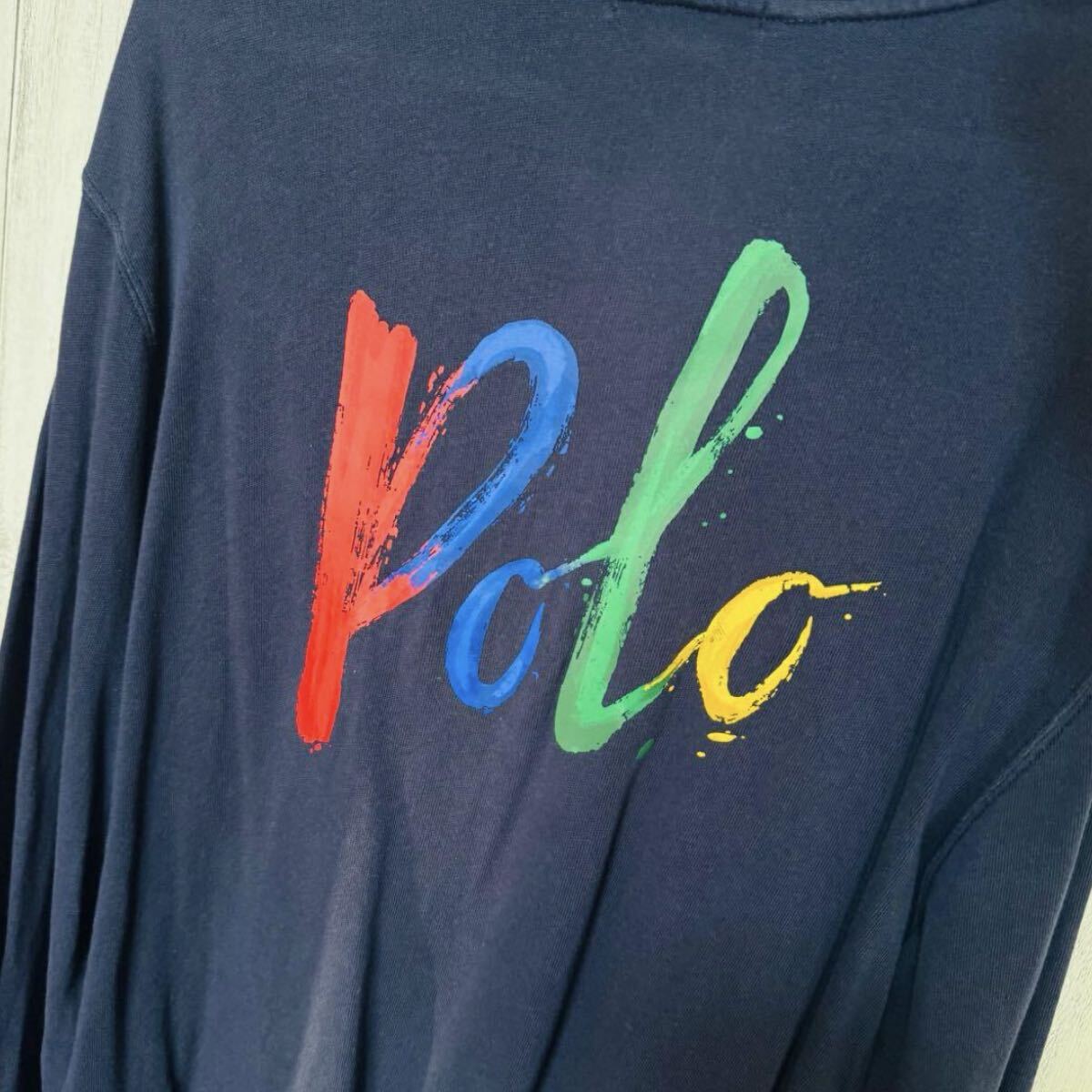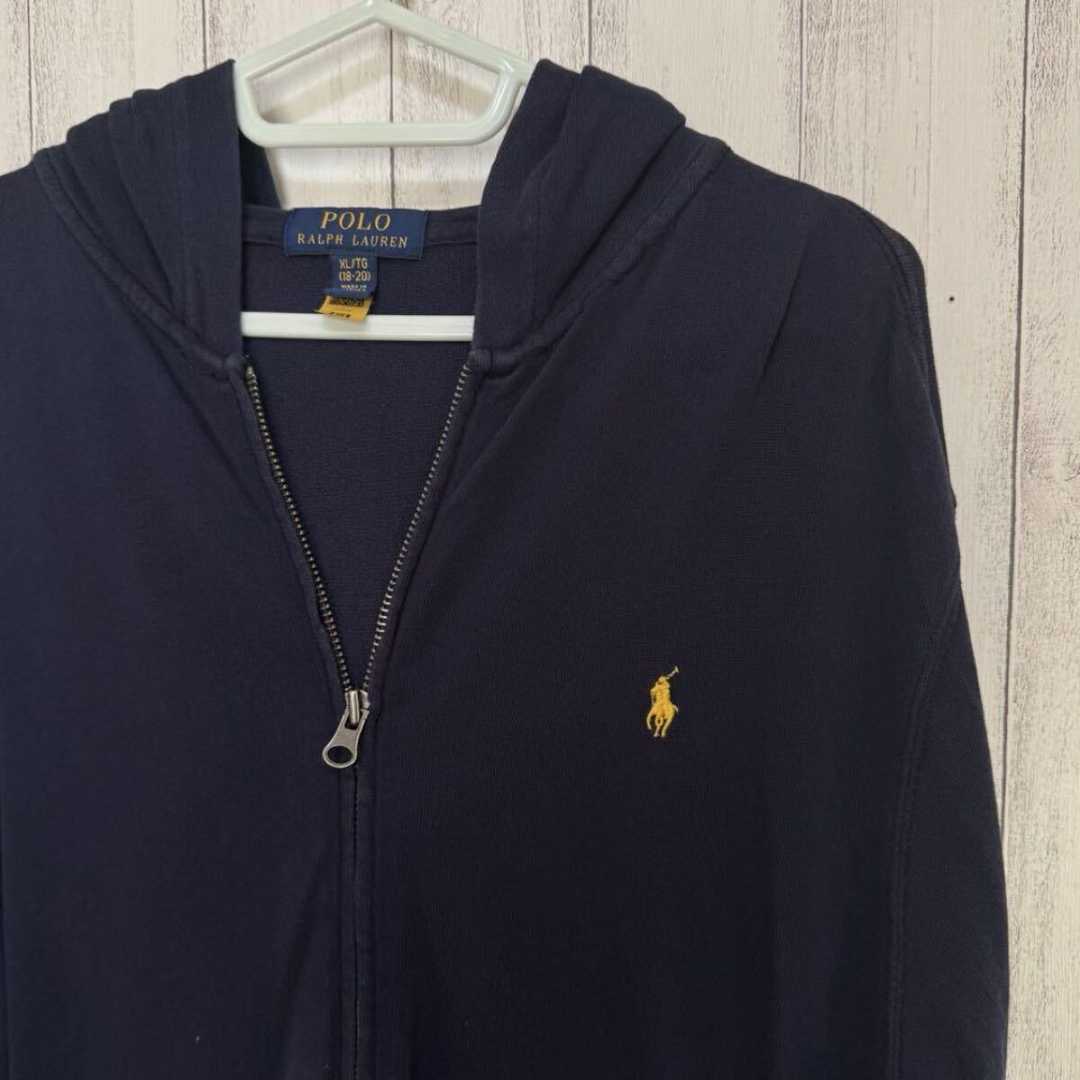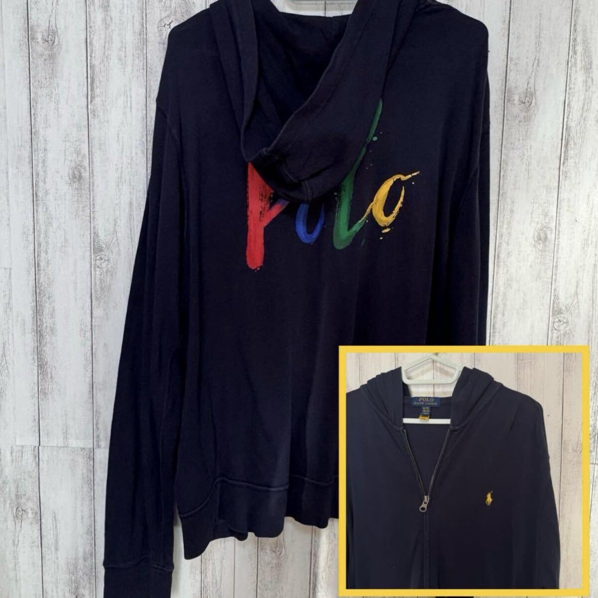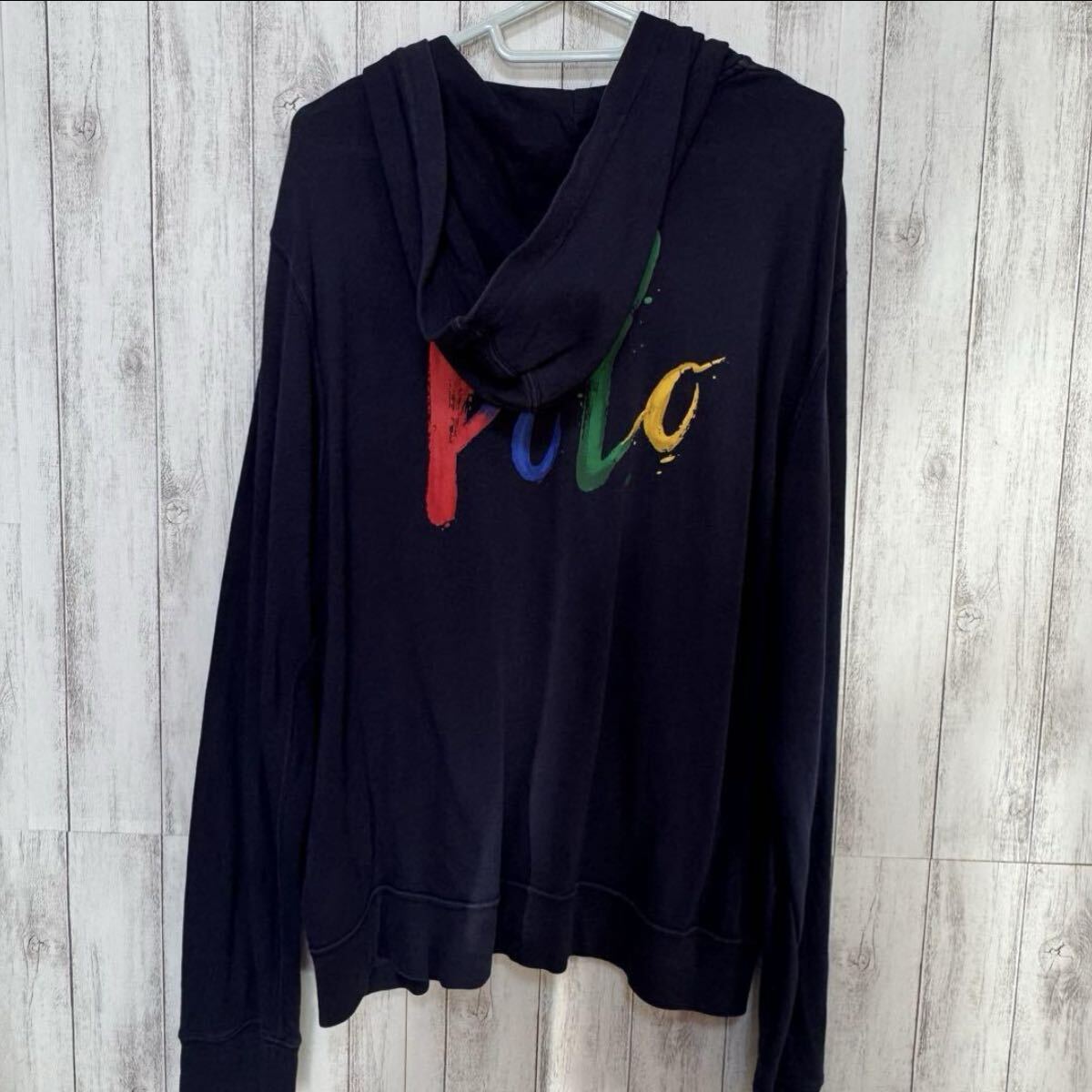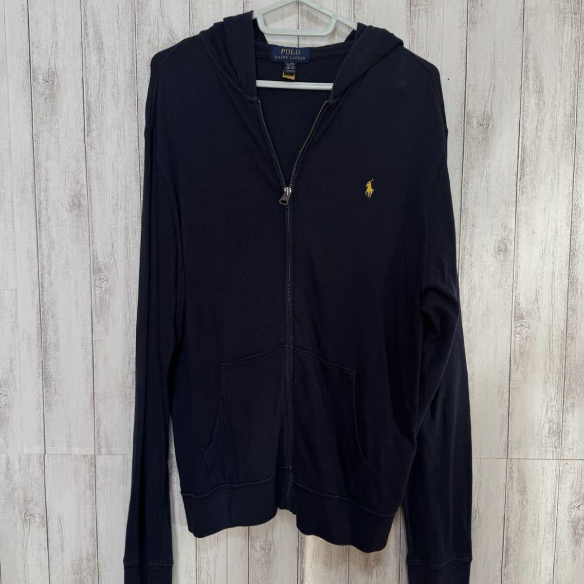ジップ付きの前にも後ろにもロゴがあるパーカー。薄手なので重ね着可能です。