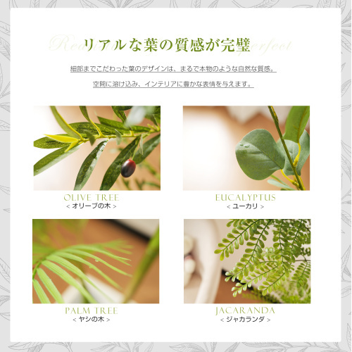 • 【リアルな葉の質感が完璧】リアルなオリーブの葉っぱの質感が、本物のオリーブの木と見分けがつかないほど精巧に再現されています。葉の色合いは自然のオリーブと同じようにグラデーションが美しく、手に触れたときの柔らかさや質感も本物そのものです。また、枝の曲線や細部まで丁寧に作られており、ナチュラルで高級感のある仕上がりが特徴です。