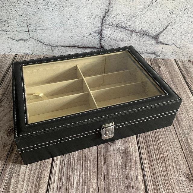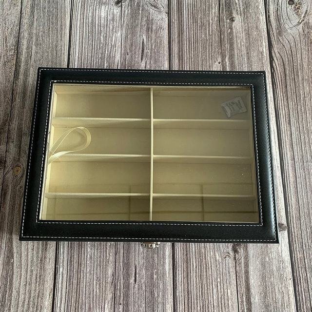 ■レザー調に仕上げた上部に天窓 ■窓の部分にはステッチが入っていて高級感もあります。 ■ディスプレイ感覚で収納 ■メガネやアクセサリーを見せる収納ができます。 ■内部のクッションは優しい起毛素材で大事なメガネをしっかり守ります。 ■仕切りは取り外しができ、小物収納が目的のジュエリーボックス?仕切りケースとしてもご利用頂けます。