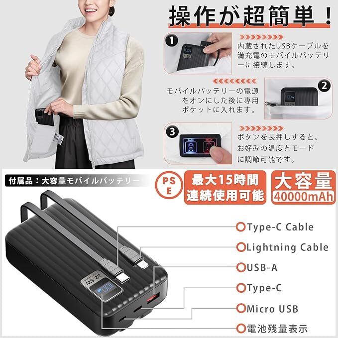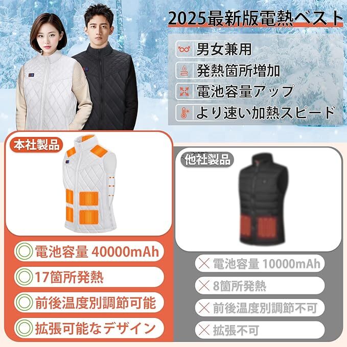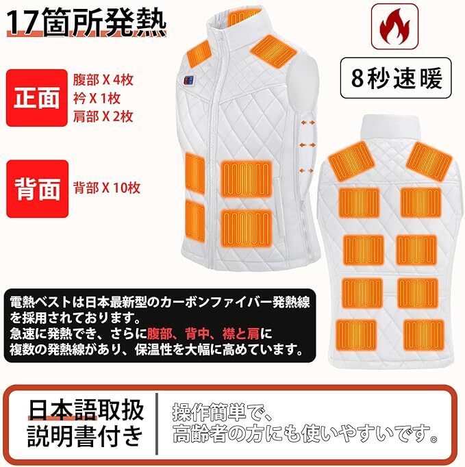 電熱ベスト ヒーターベスト ホワイト Sサイズ 拡張機能 17箇所発熱 40000mAh 速暖 三段階温度調節 防寒 簡単収納 水洗い可 男女兼用