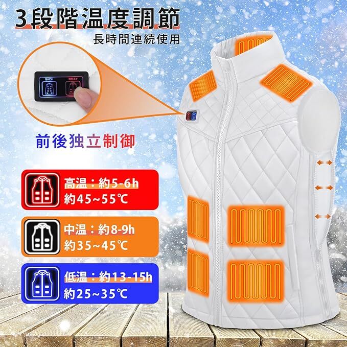 前後それぞれ独立して温度を調節できるので、「背中は熱めに」「お腹は控えめに」と自分好みの暖かさを簡単に設定できます。