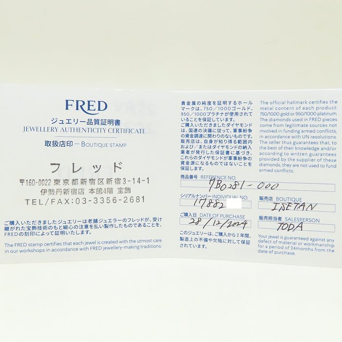 FRED フレッド フォース10 ネックレス ダイヤモンド スモールモデル 7B0281 K18WG ホワイトゴールド レディース/294356【中古】