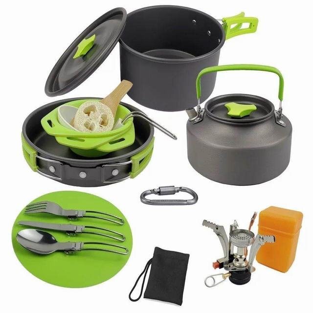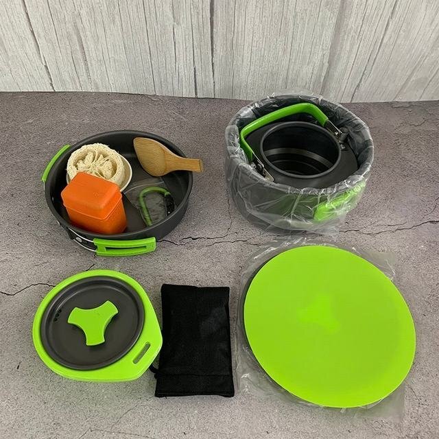 アウトドアクッカーのセットです。 鍋*1,フライパン*1,やかん*1,木製シャベル*1,スプーン*1,テーブルナイフ*1,フォーク*1,バーナー*1,食品レベルPPお碗*3,PPカッティングボード*1,スポンジ*1,Dリング*1,小さな布バッグ*1,収納袋*1 重量:約1050g 使用人数:2~3人(推薦) 【安全な素材】 大鍋、フライパンとティーポットが食品衛生等級のアルミ材で作られ、軽量、丈夫、耐摩耗性で焦げ付き防止仕様処理し,熱の伝導が速い。