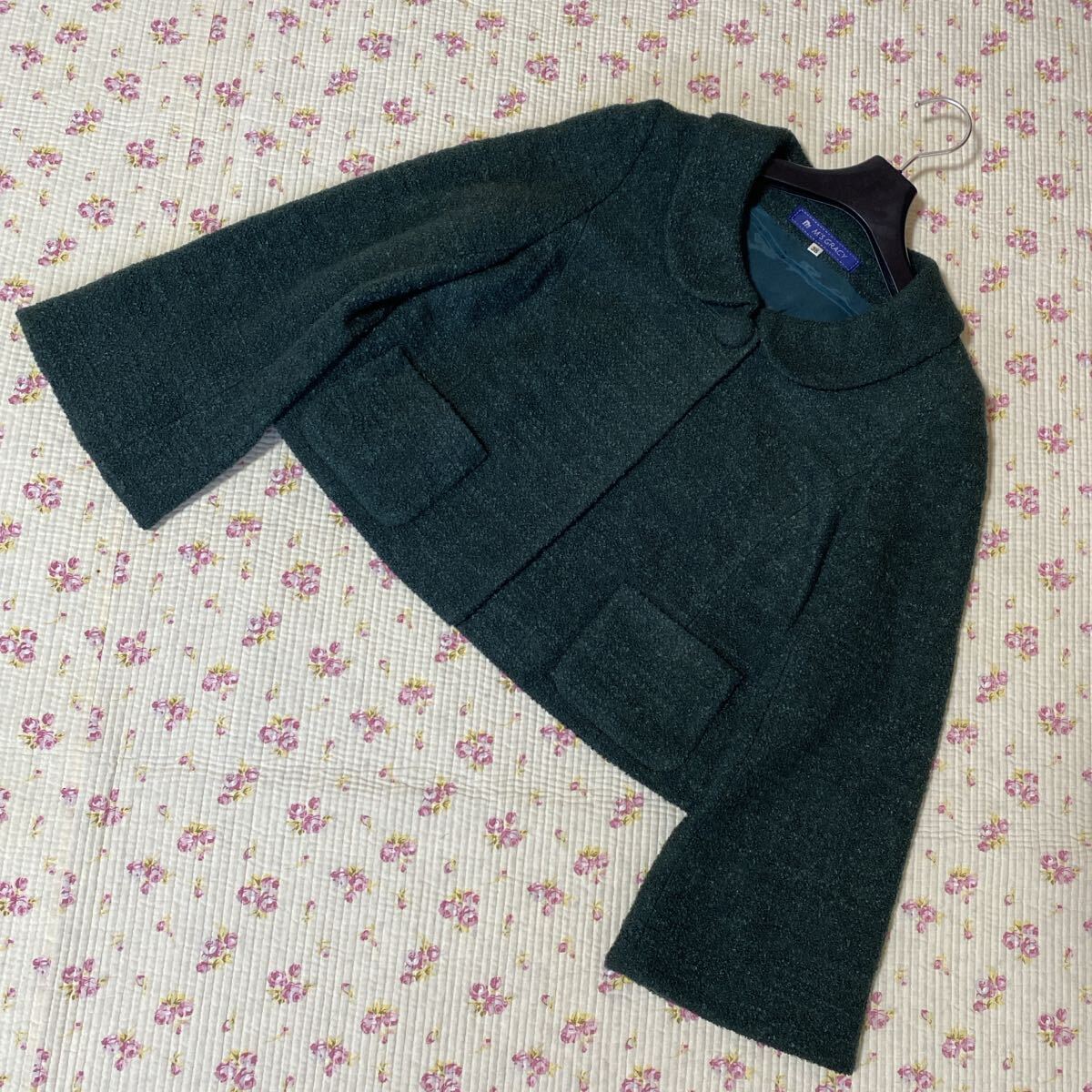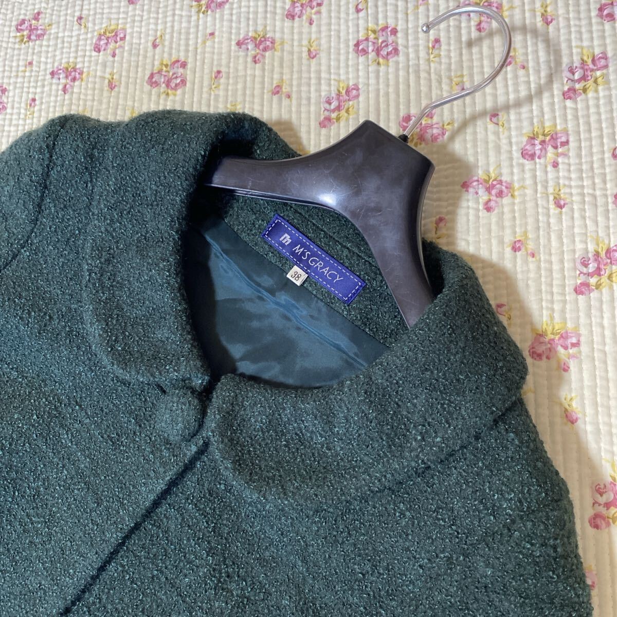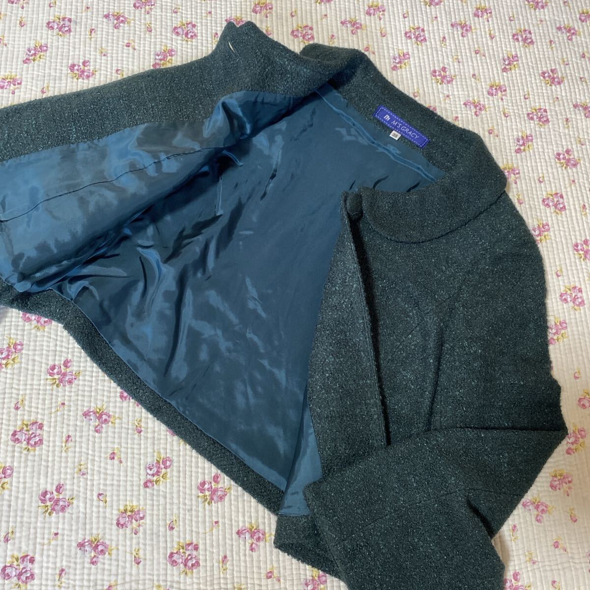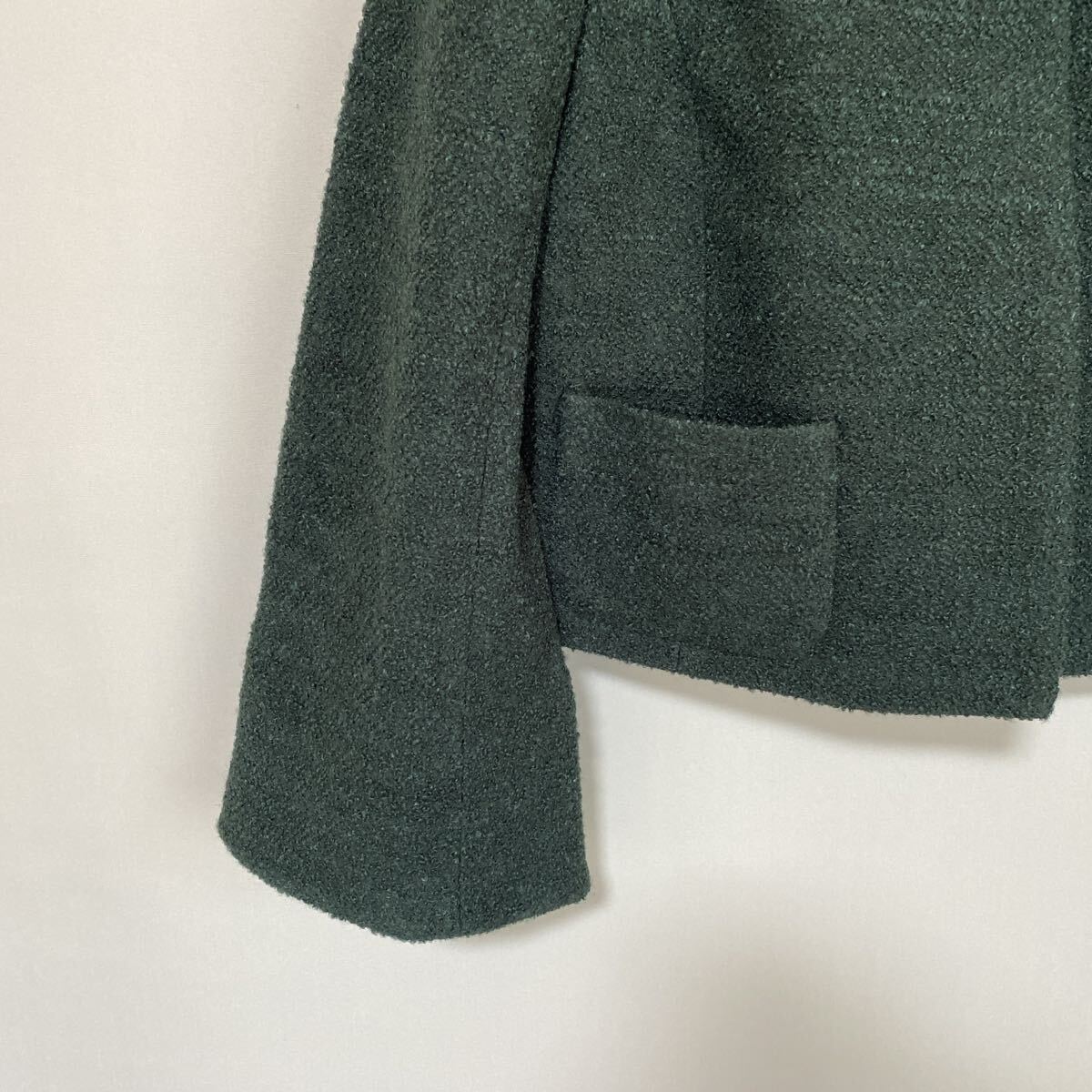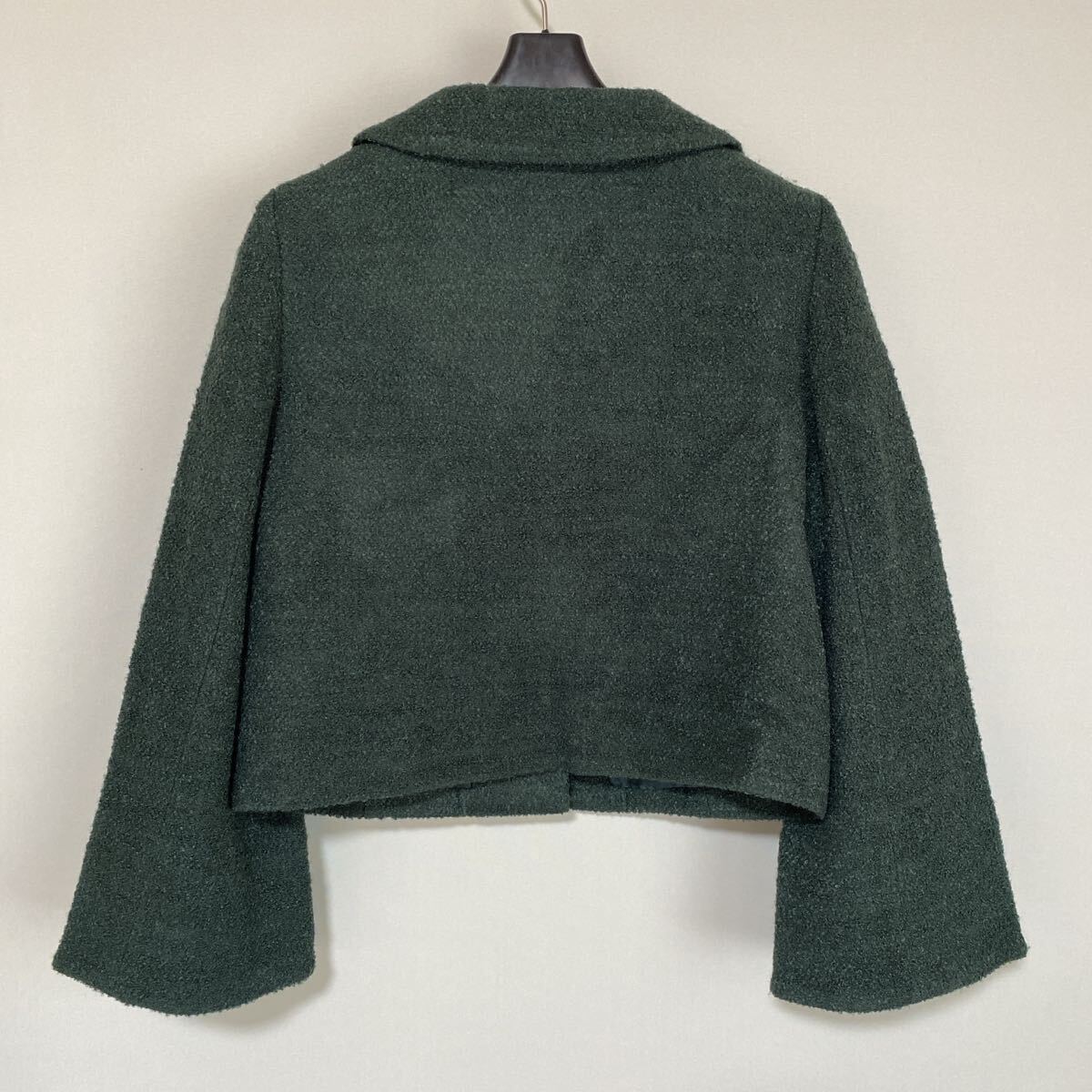 M'S GRACY(エムズグレイシー)のお品です。丸襟とツイード調の生地が特徴的な、ダークグリーンのショート丈ジャケットです。女性らしさを引き立てるディテールが施されていて、シルエット、お色が美しく、上品に清楚な雰囲気で着こなせます。お色は画像でご確認下さい。グリーン系(緑色)です。実際のお色が良く出ています。春秋がベストシーズンです。フロントは上部の大きめのくるみボタン1つでとめるタイプです。ご了承の程よろしくお願いします。ノーベント。外ポケット×2。内ポケット×0。染み、汚れ、ほつれのないとてもきれいなジャケットです。日本製。Made in Japan