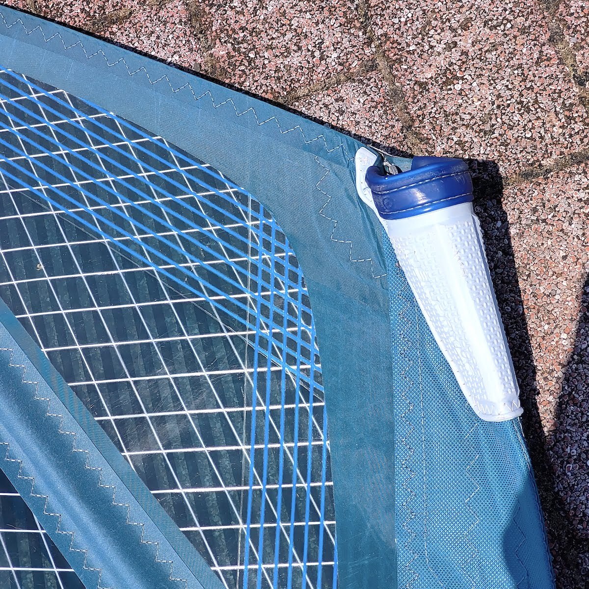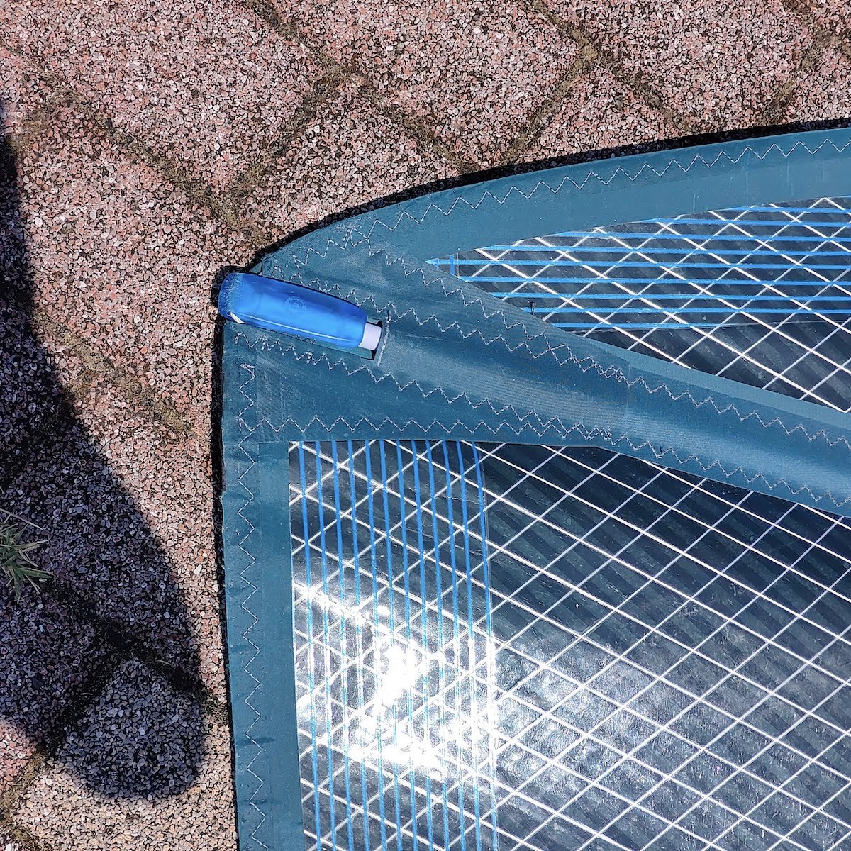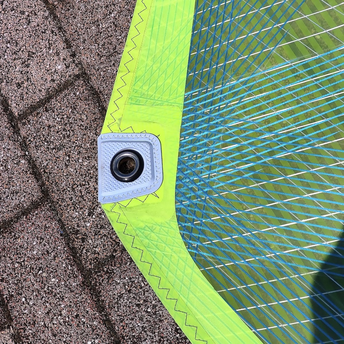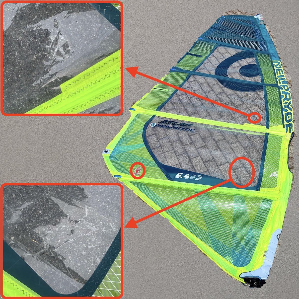 画像の様にセイルトップやバテンエンドやアウトホール周辺のスレも少なく全体的にキレイな状態ですが、パネルに数箇所リペアがあり、大きなリペアは15cm程の敗れた箇所をセイル両面から専用リペアフィルムを貼って補修しています。(画像7番目参照)この状態で波に巻かれても問題なく使用できました。