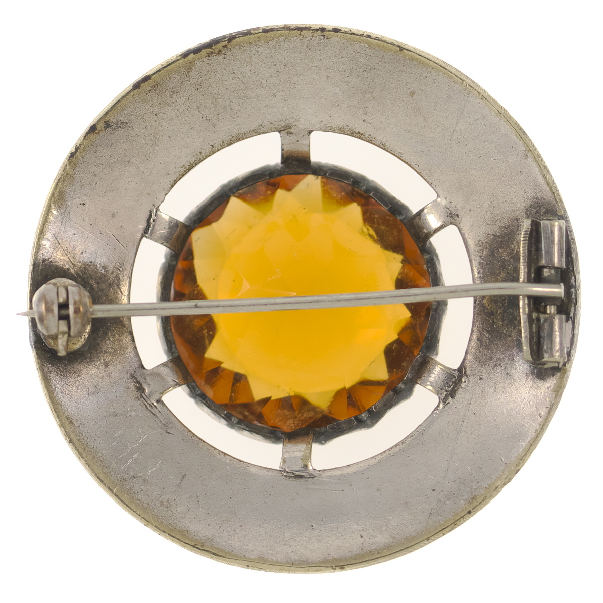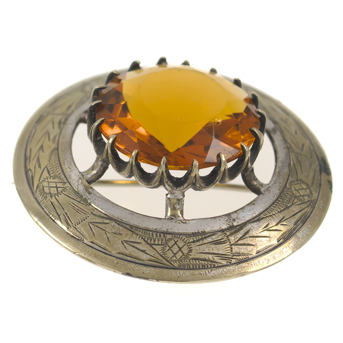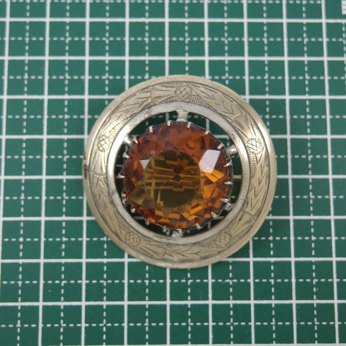 UK4205◆ ラウンド アザミの花 アンバー系ストーン フラワーモチーフ ケルト 色石 イギリス 英国 ◆ ヴィンテージブローチ ◆