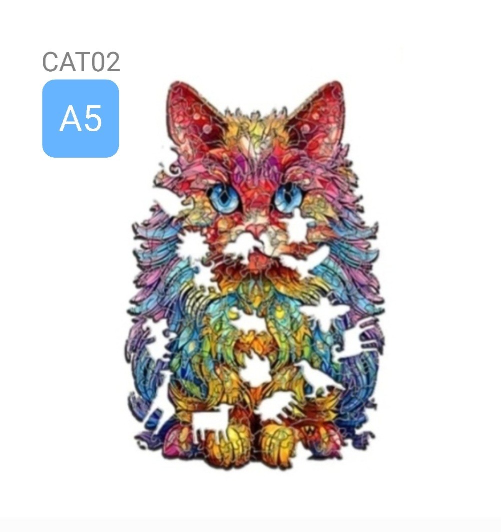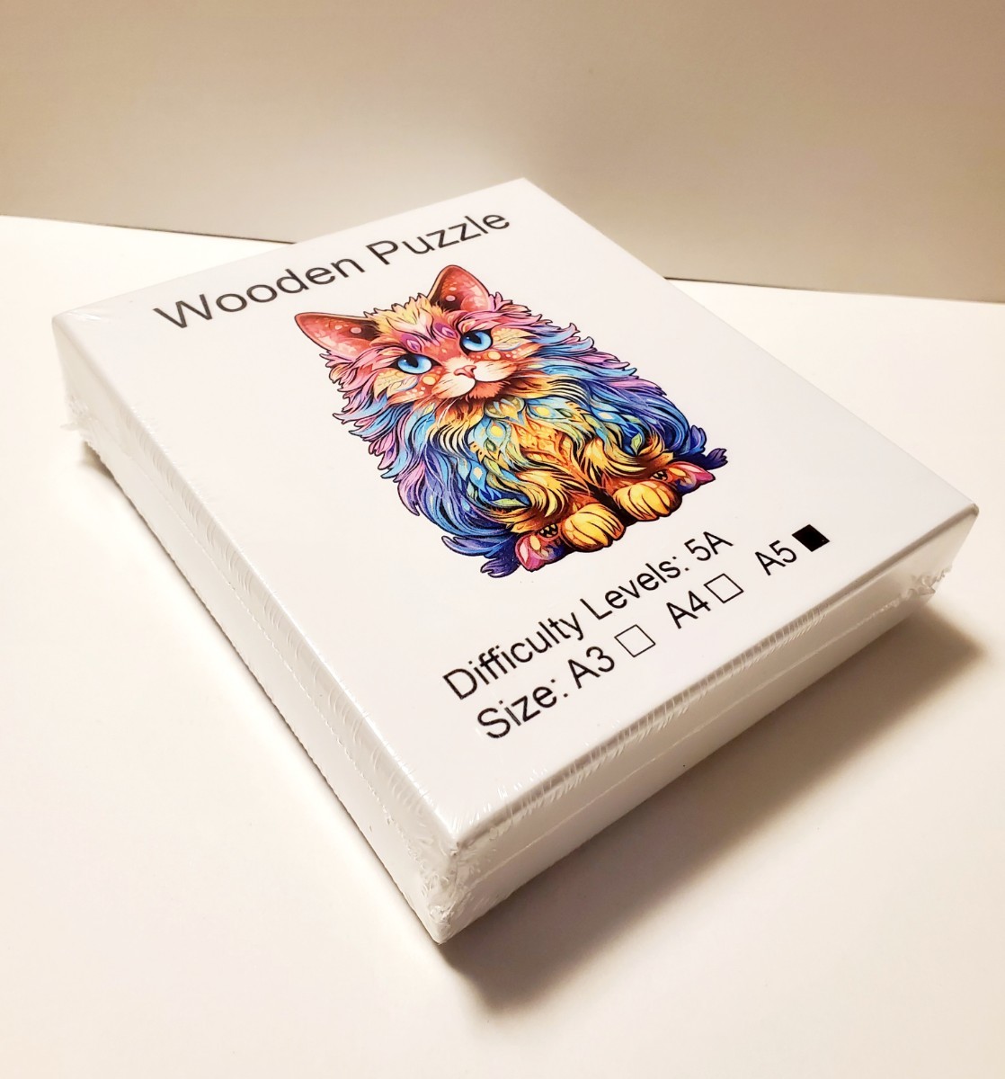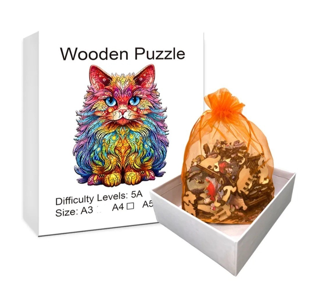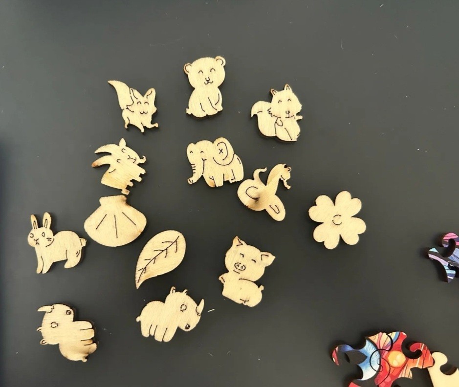 木製のジグソーパズルは、動物や植物のような形をした小さなピースでできています。