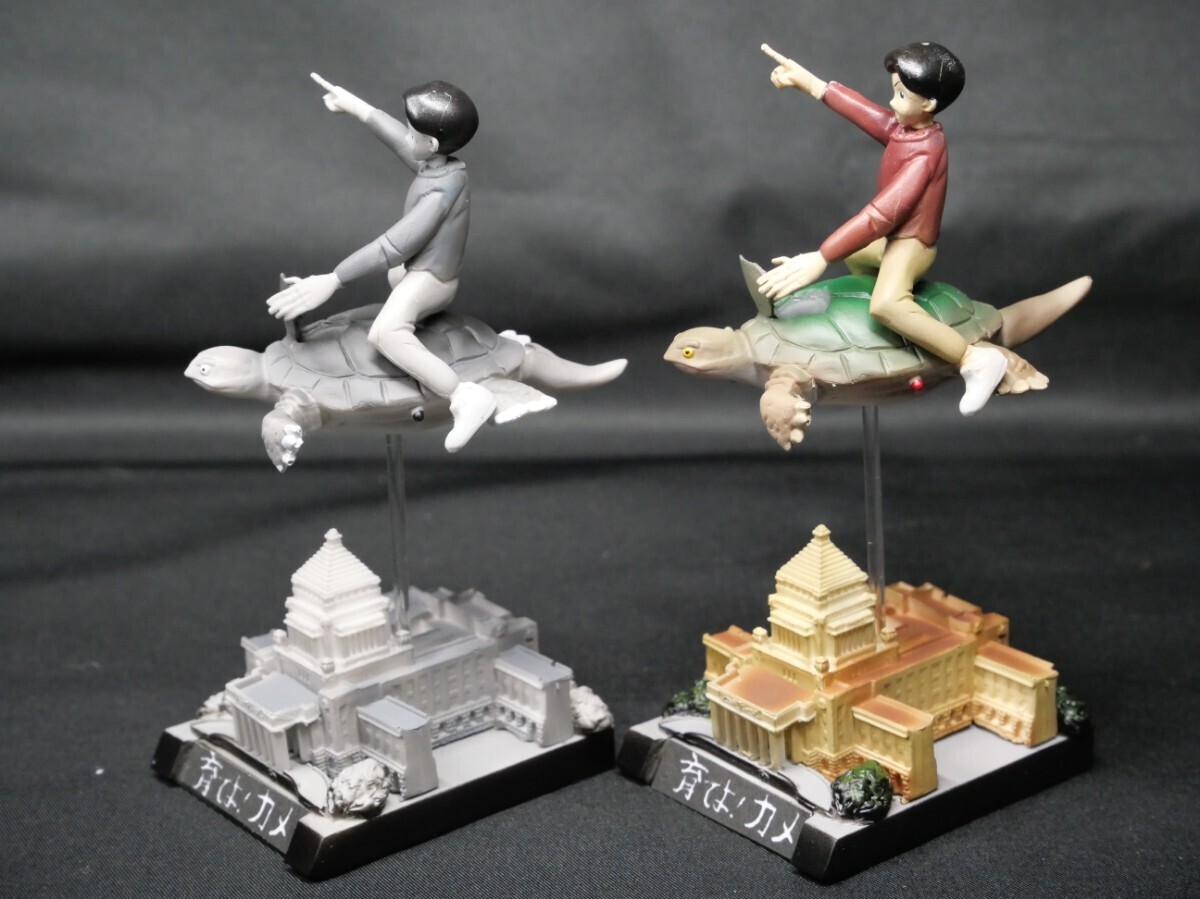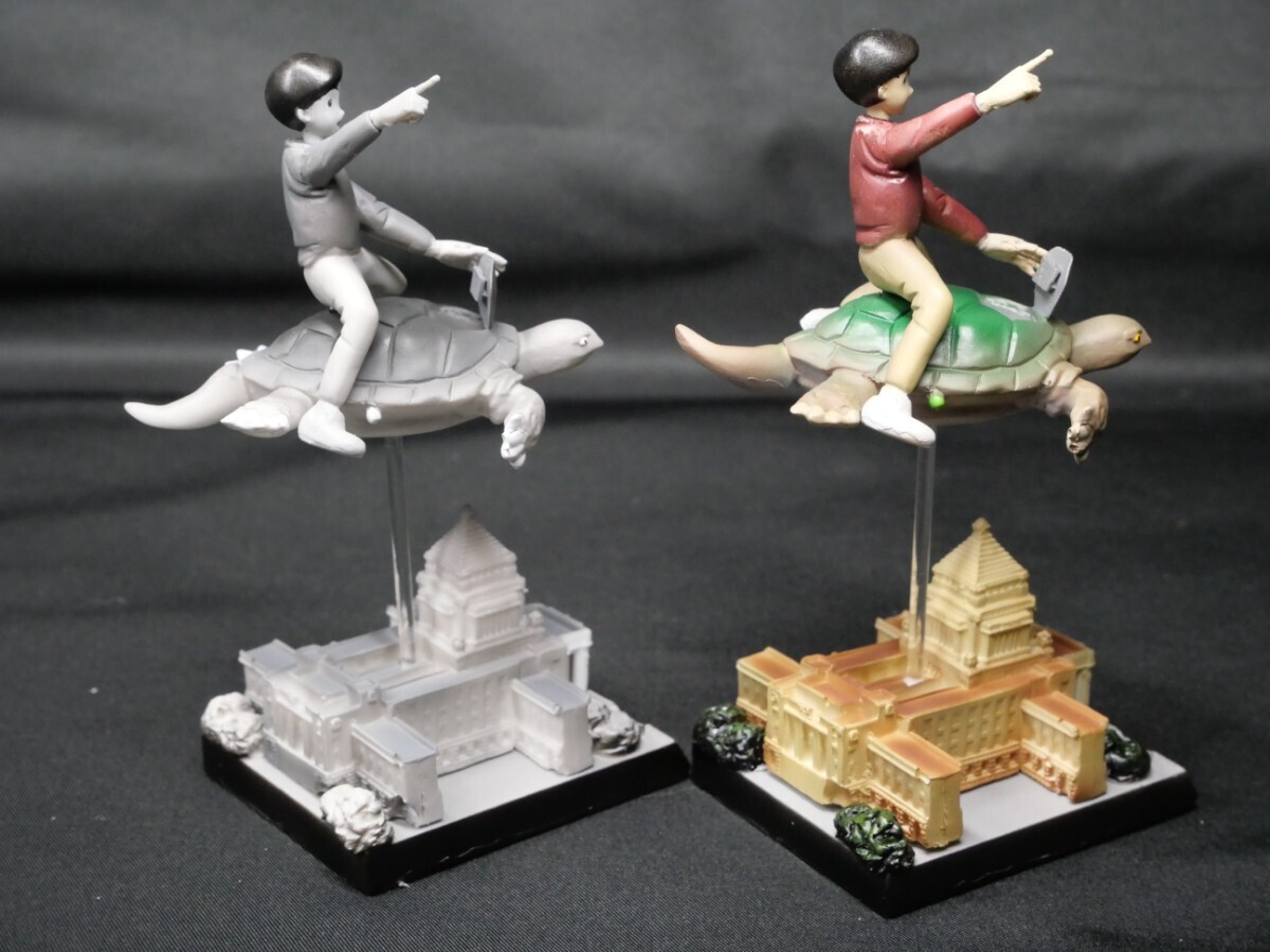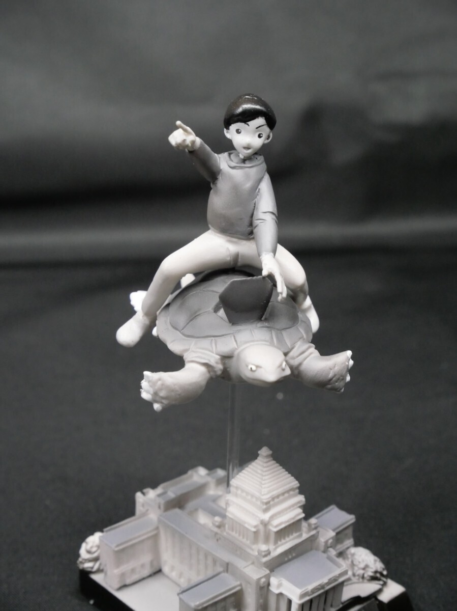 の4から出来ています、大亀、少年ともに取り外しも付けも簡単に出来ます、大亀とベースにははめる穴をあけていますのでクリアー帽をさしてもらい設置してお楽しみ下さい(^^)