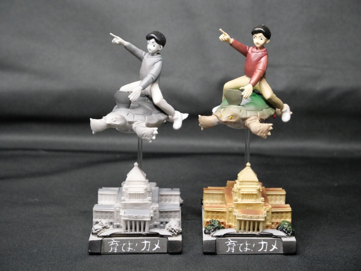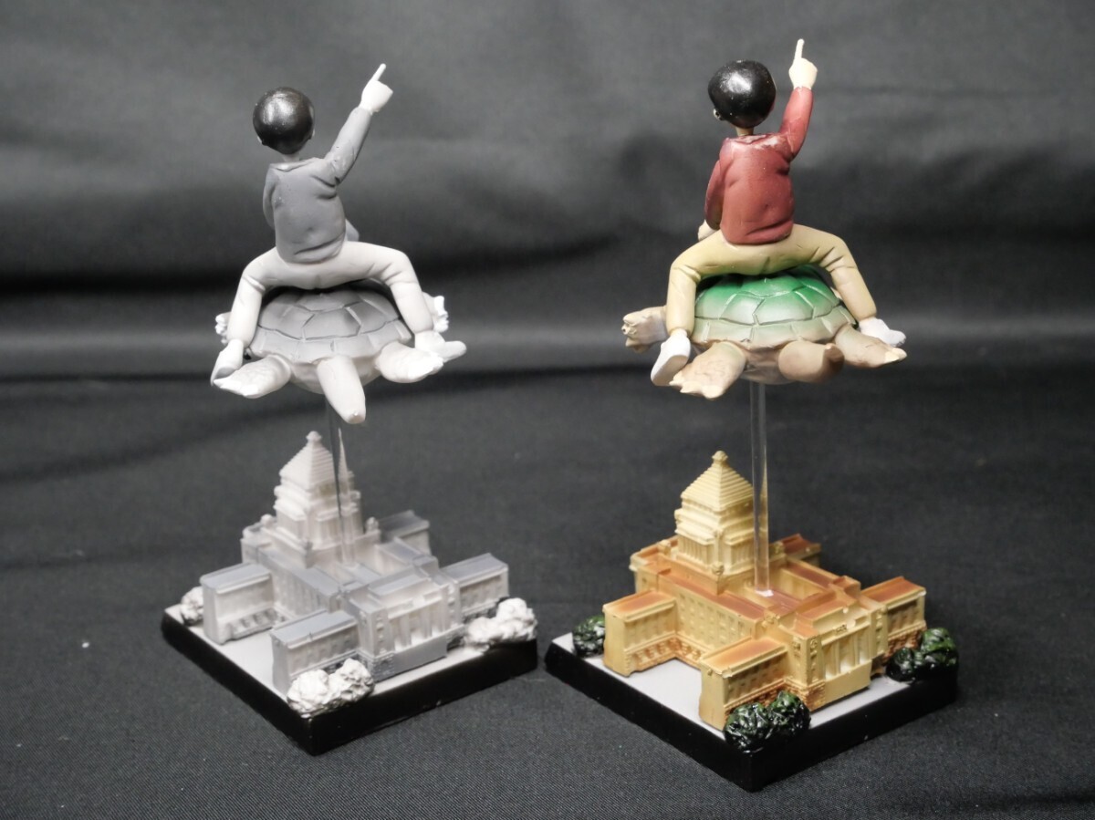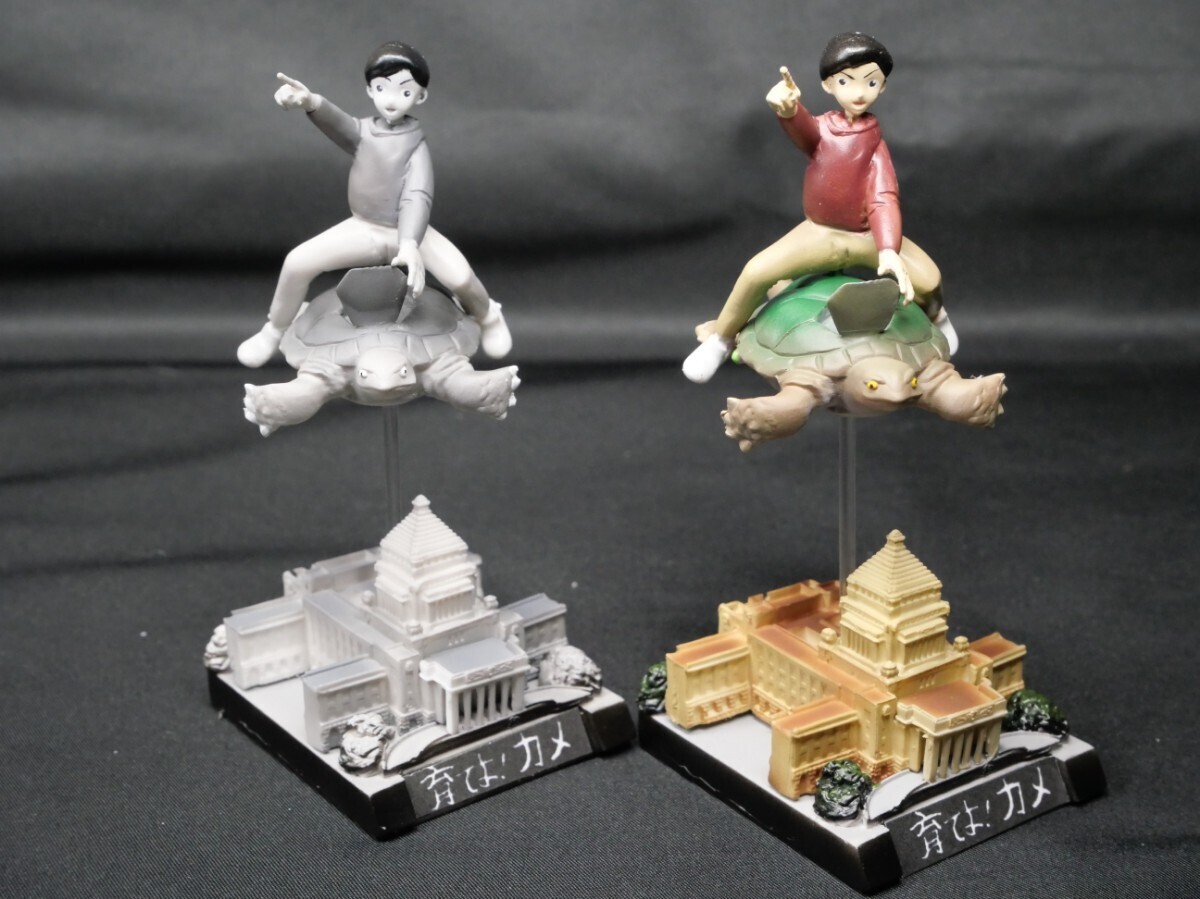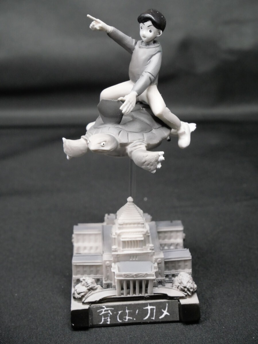 の4から出来ています、大亀、少年ともに取り外しも付けも簡単に出来ます、大亀とベースにははめる穴をあけていますのでクリアー帽をさしてもらい設置してお楽しみ下さい(^^)