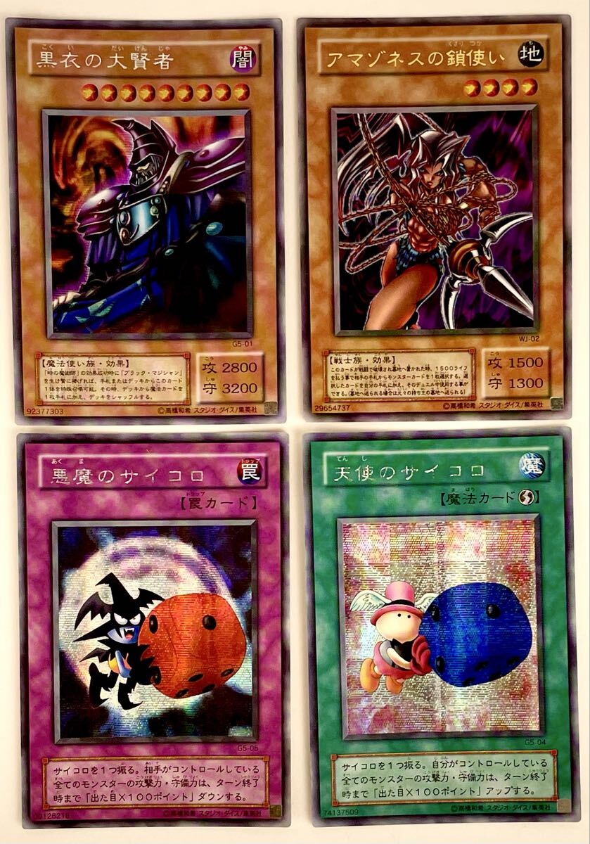 【SO083】遊戯王 カード おまとめ 4枚セット デュエルモンスターズ 黒衣の大賢者 アマゾネスの鎖使い 悪魔のサイコロ 天使のサイコロ