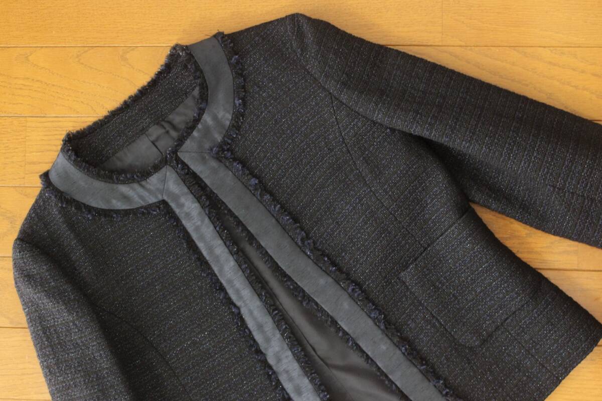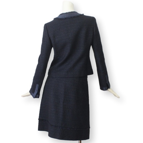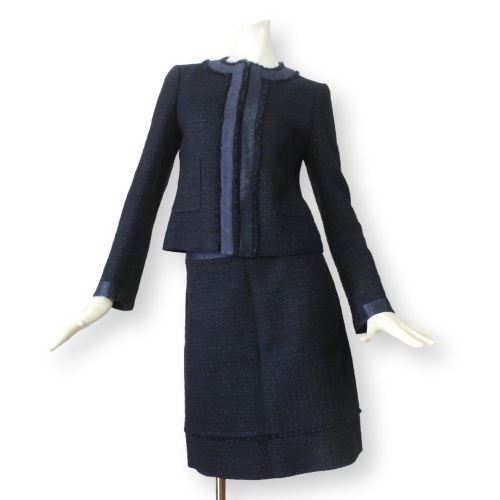 上品なネイビー(紺)ツイード生地が、落ち着きと華やかさを両立。