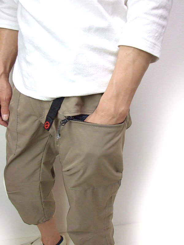 フロント開閉はジップ式。ウエストはサイズ調節可能なウェビングベルト、ゴムで伸縮する機能性に長けたディテール。