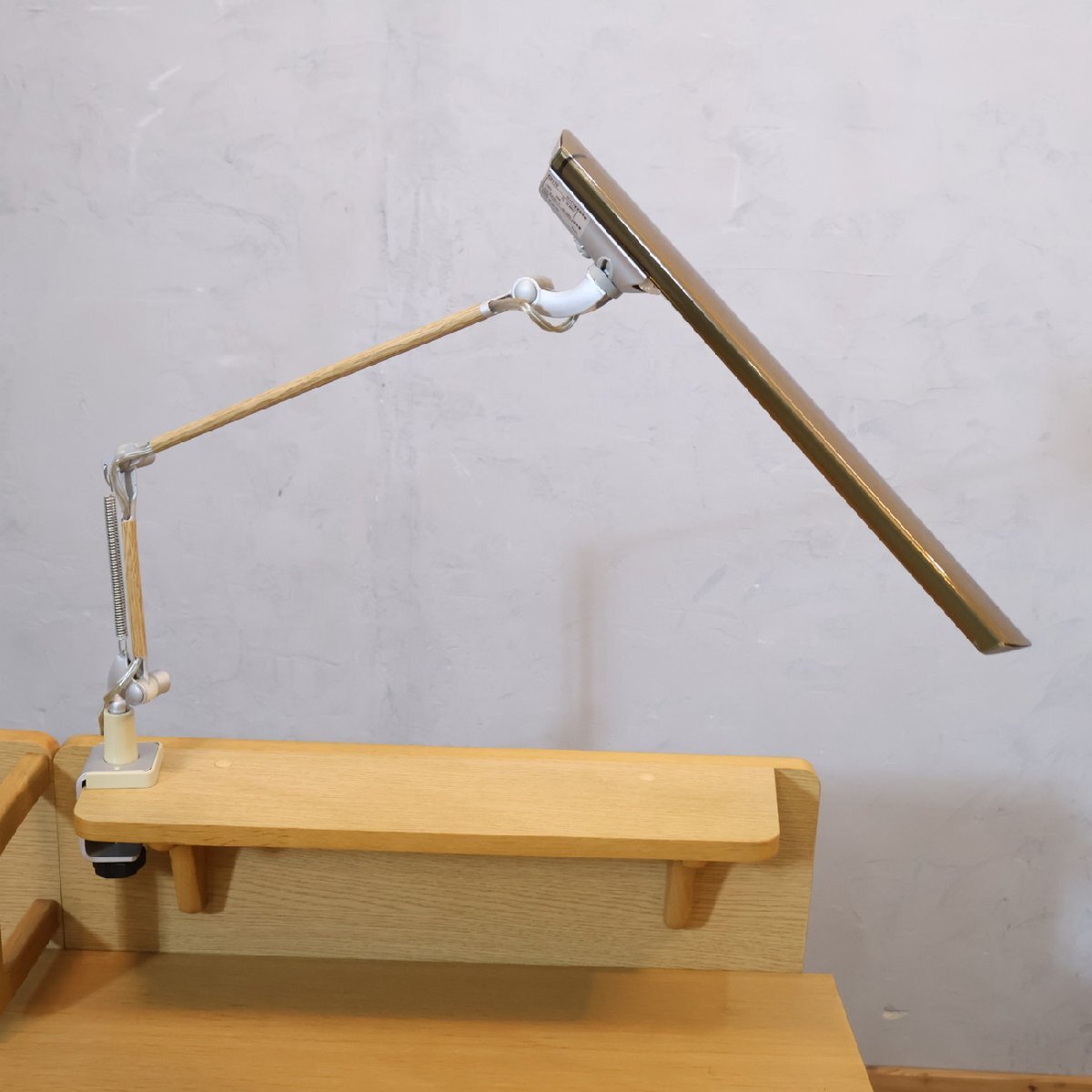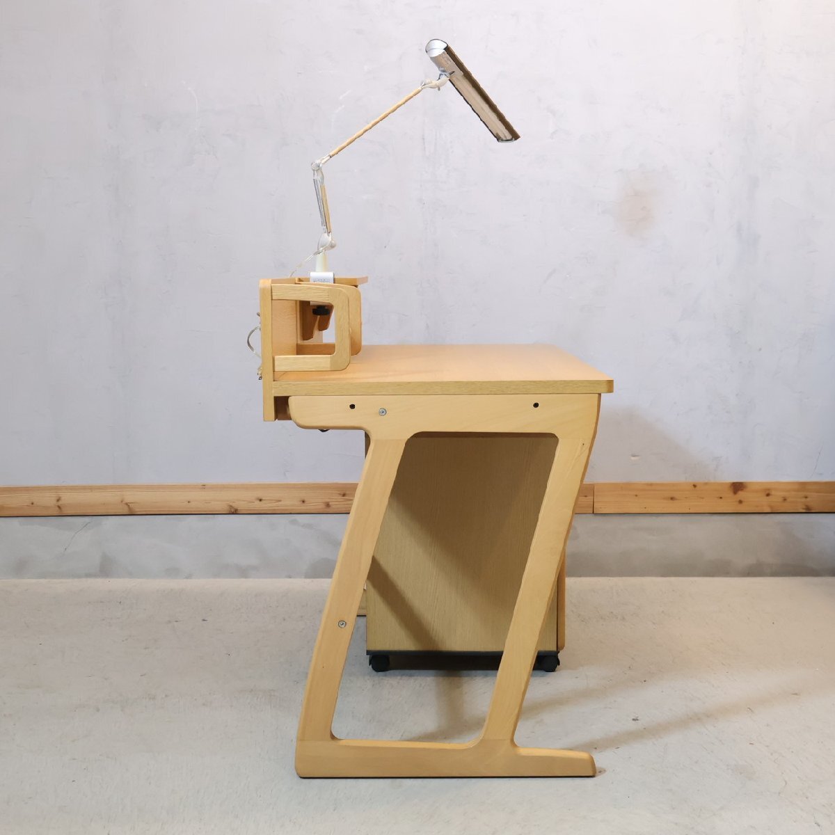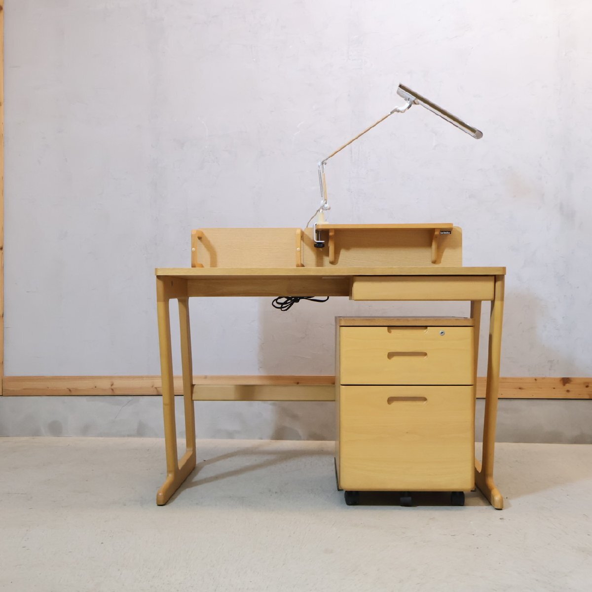 デスク、ワゴン、ブックスタンド、デスクライトがセットになった使い勝手の良い学習机。シンプルで丸みを帯びた優しいデザインはどんなインテリアにも合わせやすく、