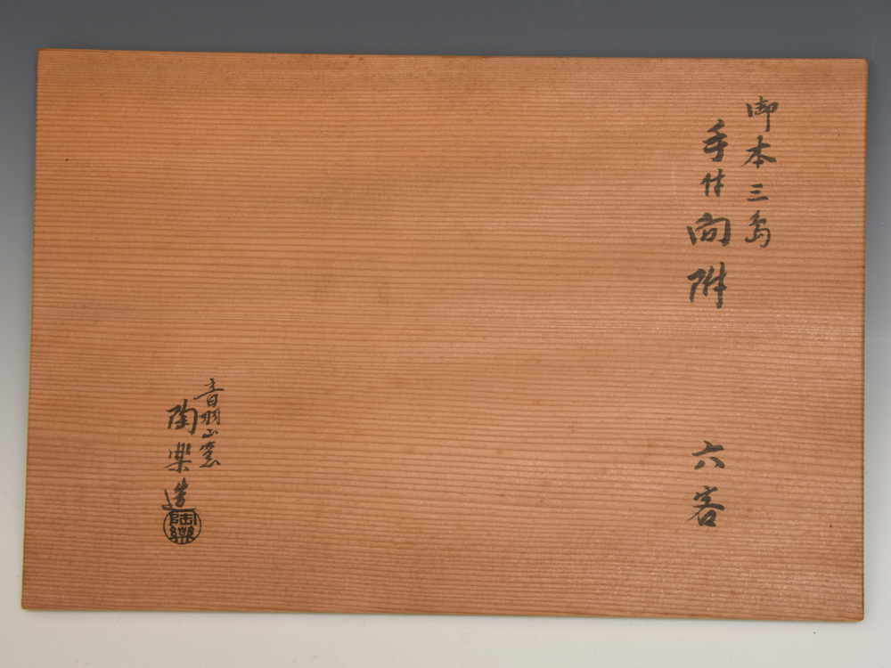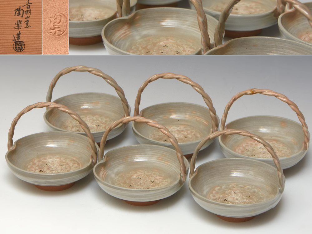 音羽山窯 陶楽(造)御本三島 手付 向付 6客です。 三島手が施された手付きの向付です。 高台内に「陶楽」銘あり。 丁寧に保管管理されており、著しい汚損破損はございません。 ※撮影の際に生じた写り込みなどがございます。 ご理解の程よろしくお願い致します。 |
