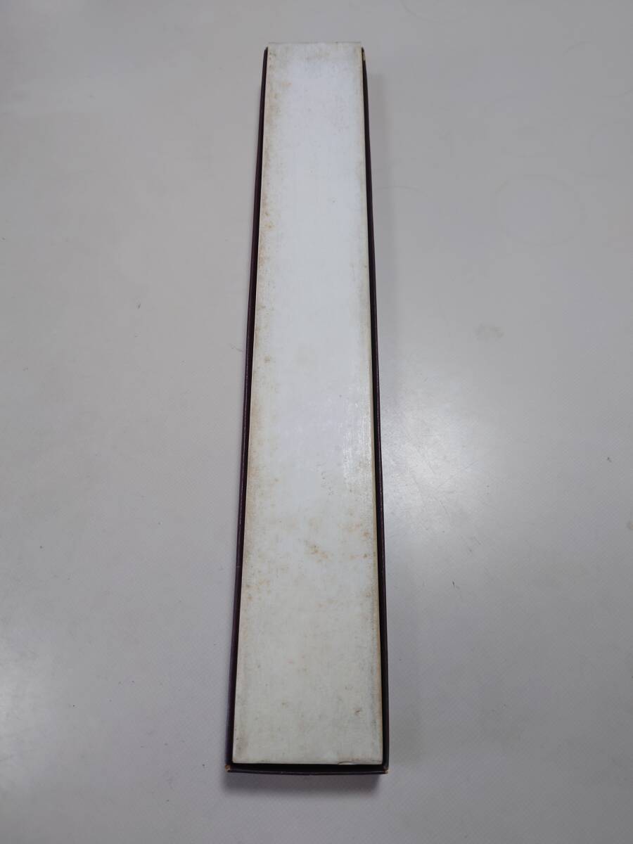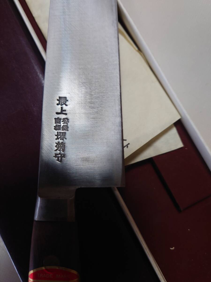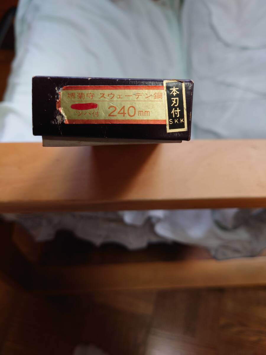 外箱には堺菊守スウェーデン鋼ツバ付き筋引240mmと記載がありますが筋引がマジックでけされてるようにも見えます。