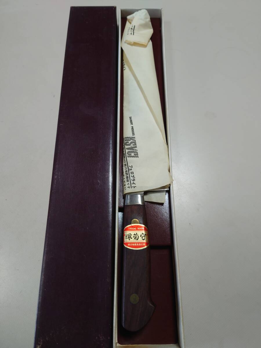 新品未使用の堺菊守のスウェーデン鋼240mmの洋包丁になります。