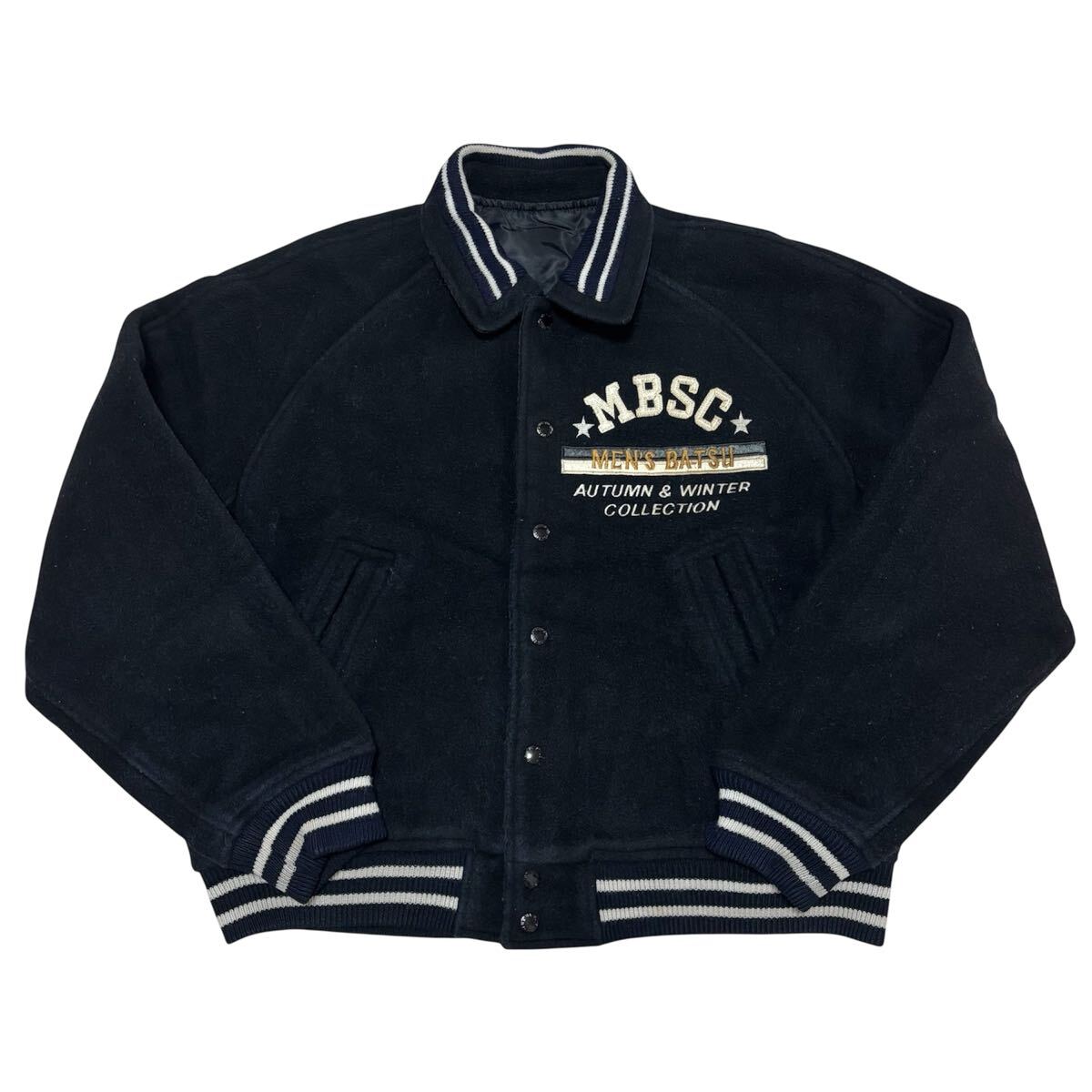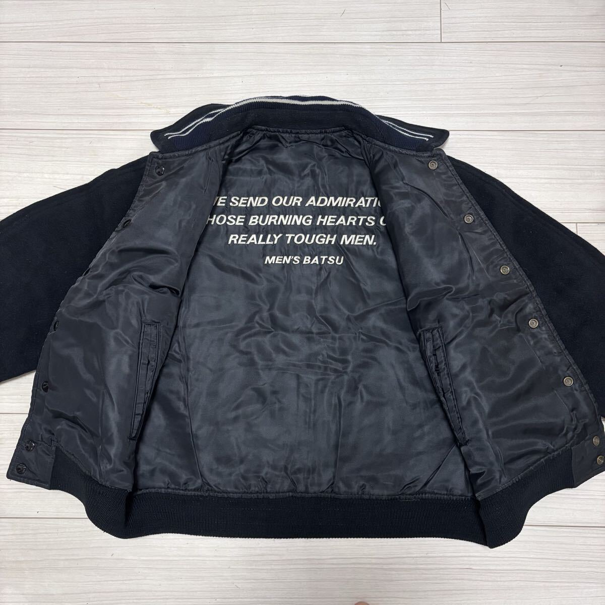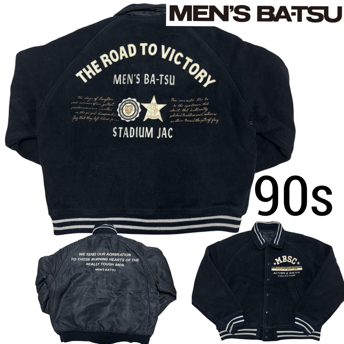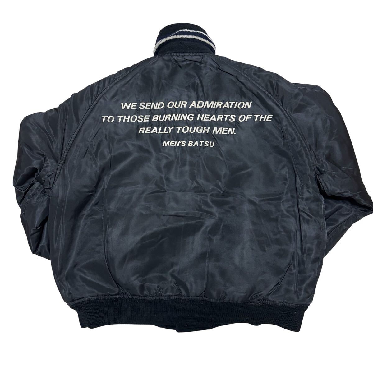 こちらは、90s■MEN'S BATSU■アーチロゴ 刺繍 リバーシブル スタジャン F 黒 ブラック リブライン メンズバツ 中綿入り archive ヴィンテージ オールド