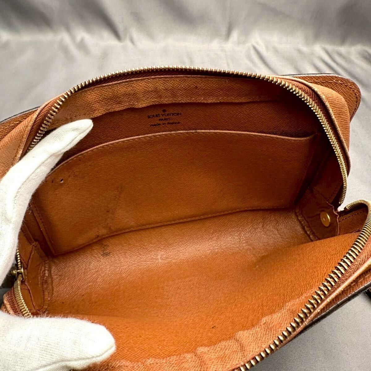 ソリございます。外ポケット内部とメインポケット内部のポケットが劣化しており使用不可となります。内部汚使用感ございます。前ポケットから内部にかけて穴ございます。ストラップが一部欠損しております。