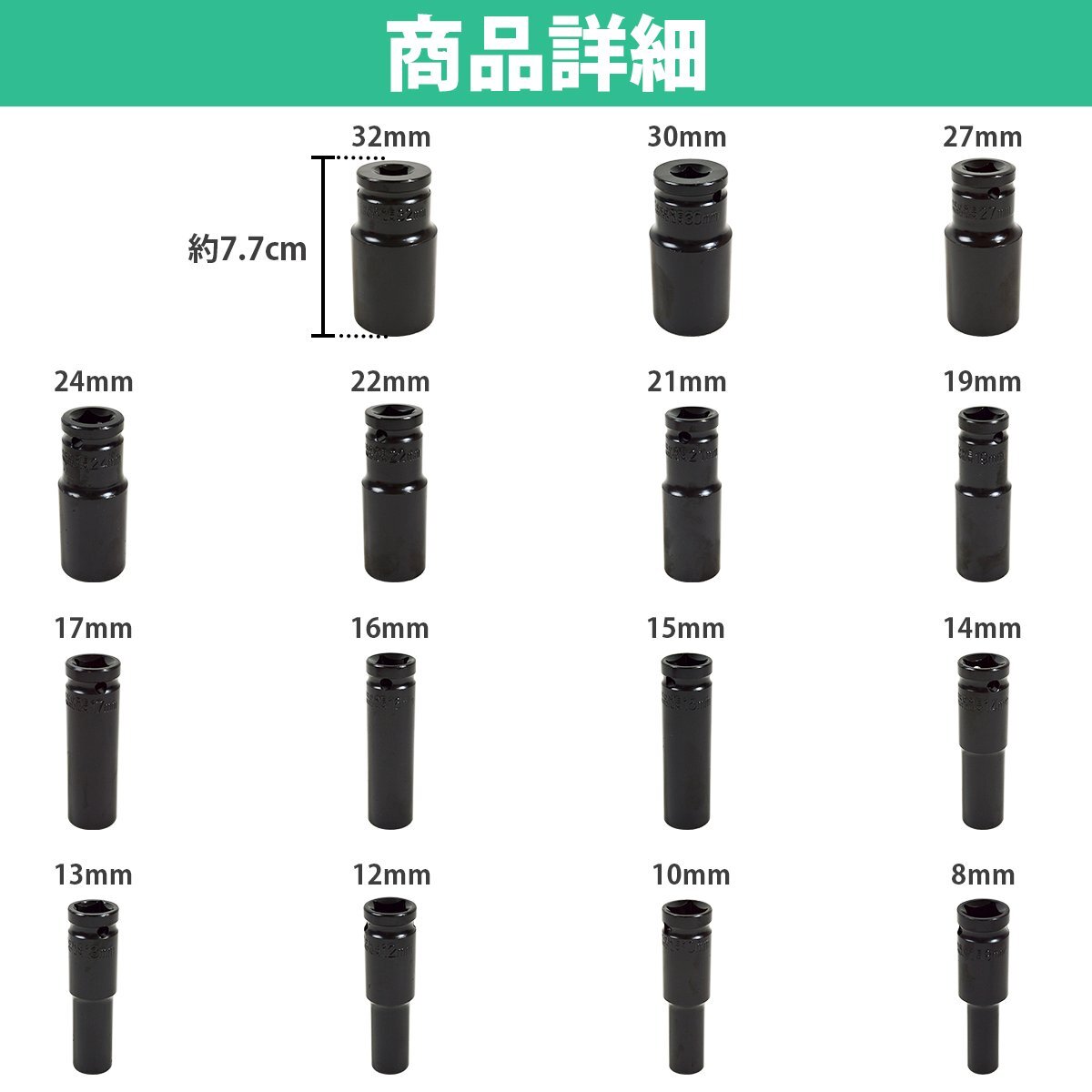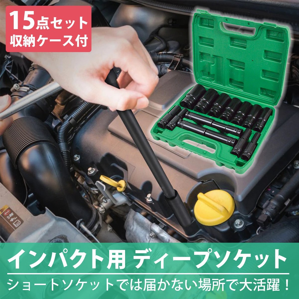 【送料無料】15本セット ディープ ソケット インパクト レンチ 差込角 12.7 1/2インチ ロング ドライバー 薄口 肉薄 整備 工具 六角軸