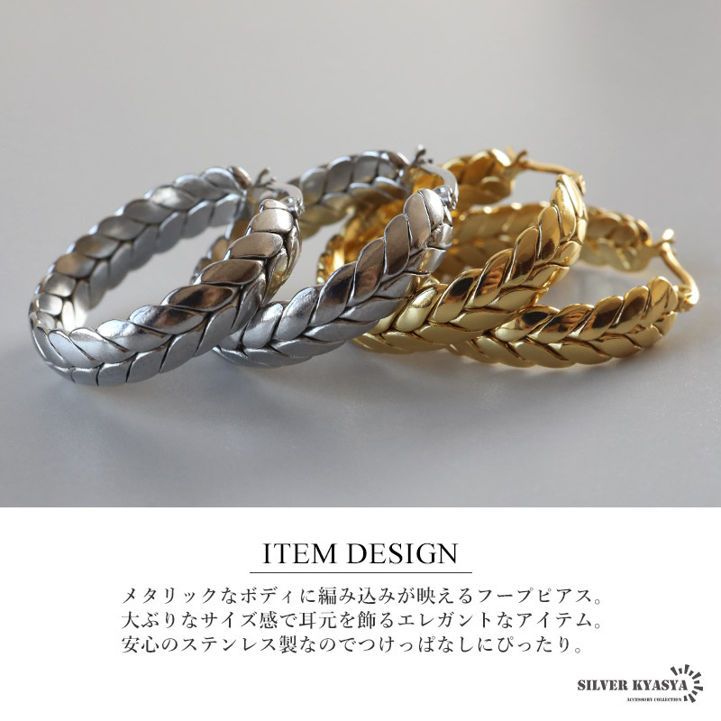 メタリックなボディに編み込みが映えるフープピアス。大ぶりなサイズ感で耳元を飾るエレガントなアイテム。安心のステンレス製なのでつけっぱなしにぴったり。