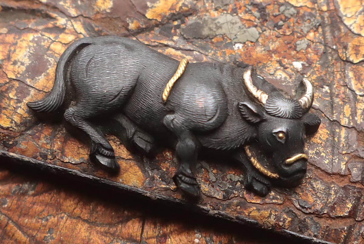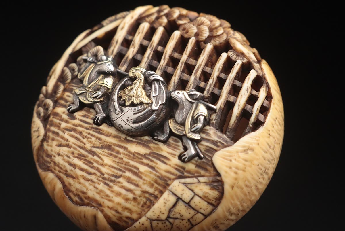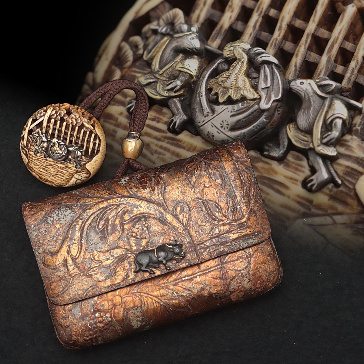| ◆ 時代 提物 鯨牙歯透彫 金工金銀嵌駕籠図饅頭根付/銅地金嵌牛図前金具/金唐革 煙草入 在銘 金工銀嵌壺緒締 喫煙古美術 ◆