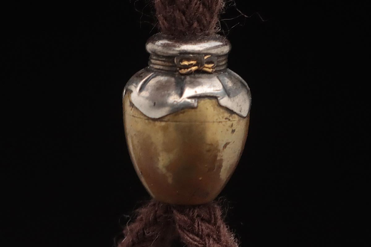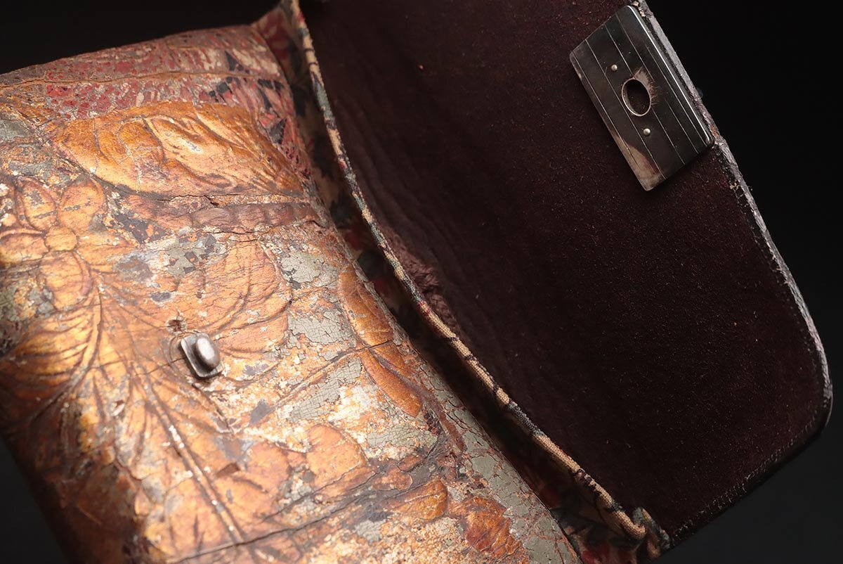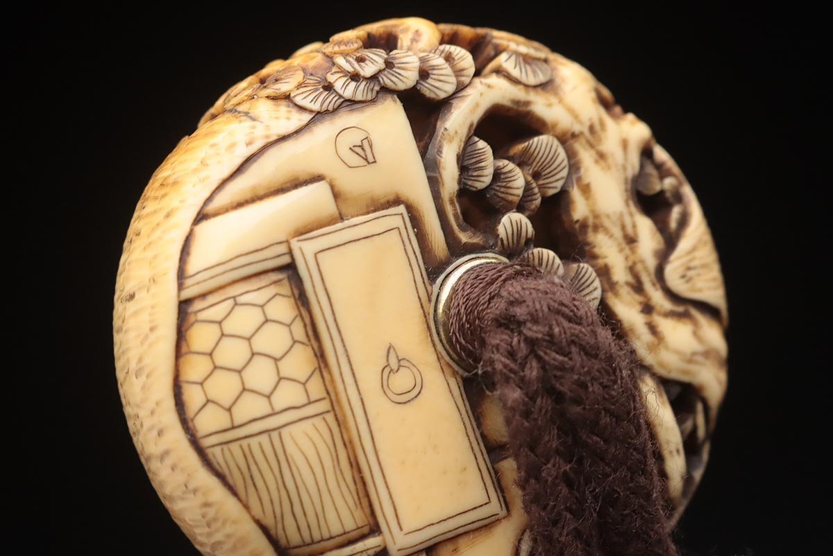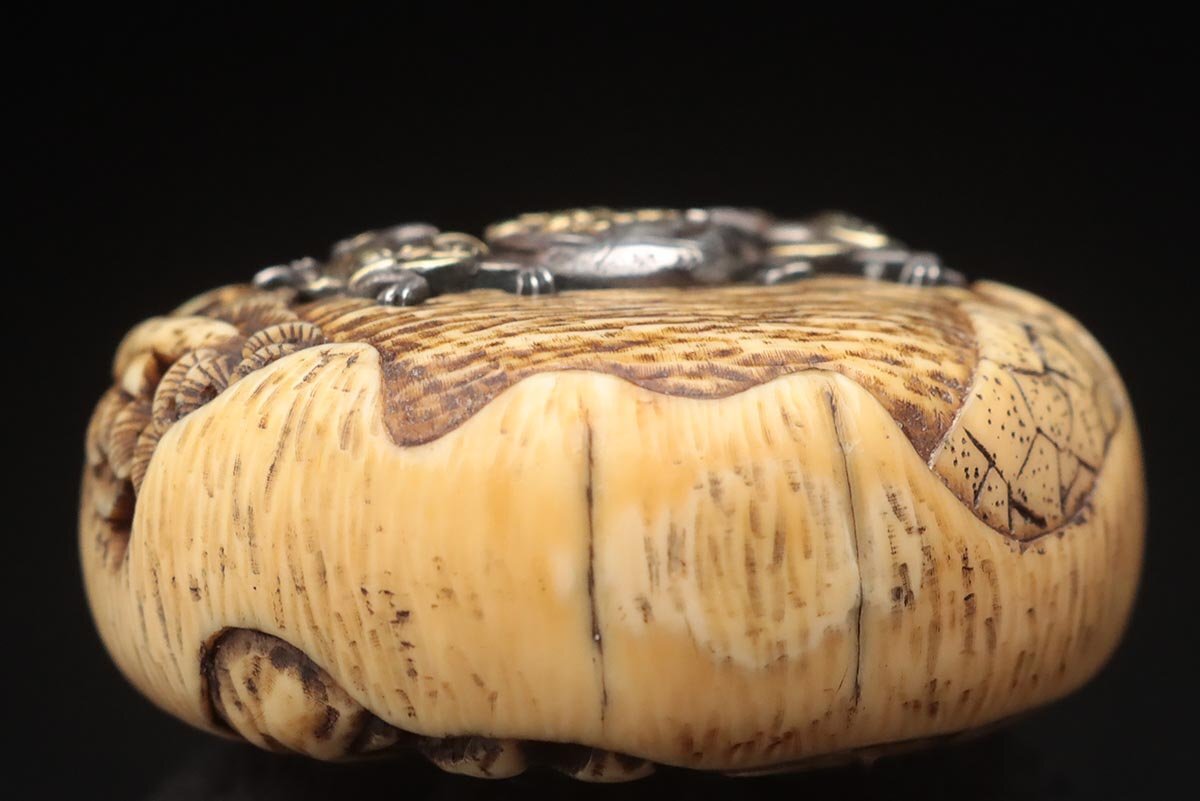 | ◆ 時代 提物 鯨牙歯透彫 金工金銀嵌駕籠図饅頭根付/銅地金嵌牛図前金具/金唐革 煙草入 在銘 金工銀嵌壺緒締 喫煙古美術 ◆
