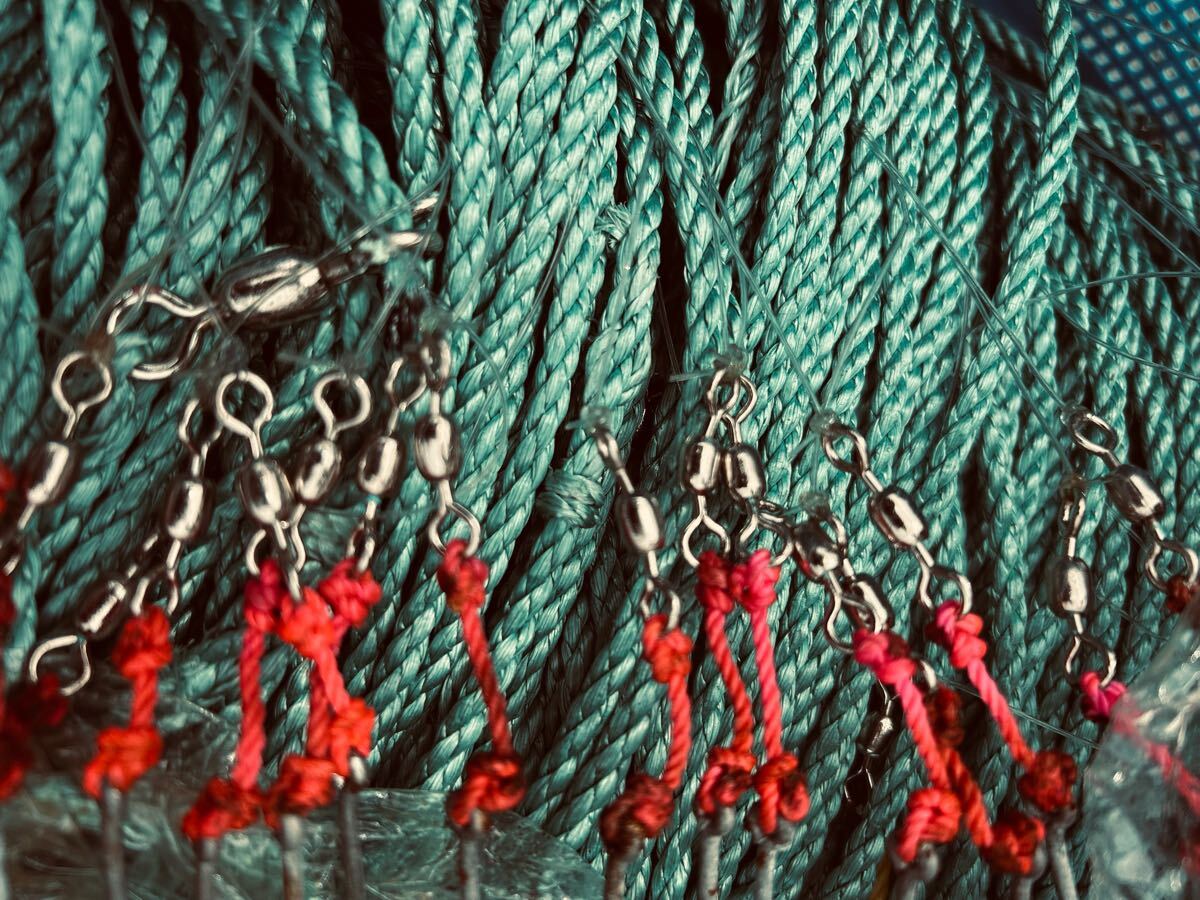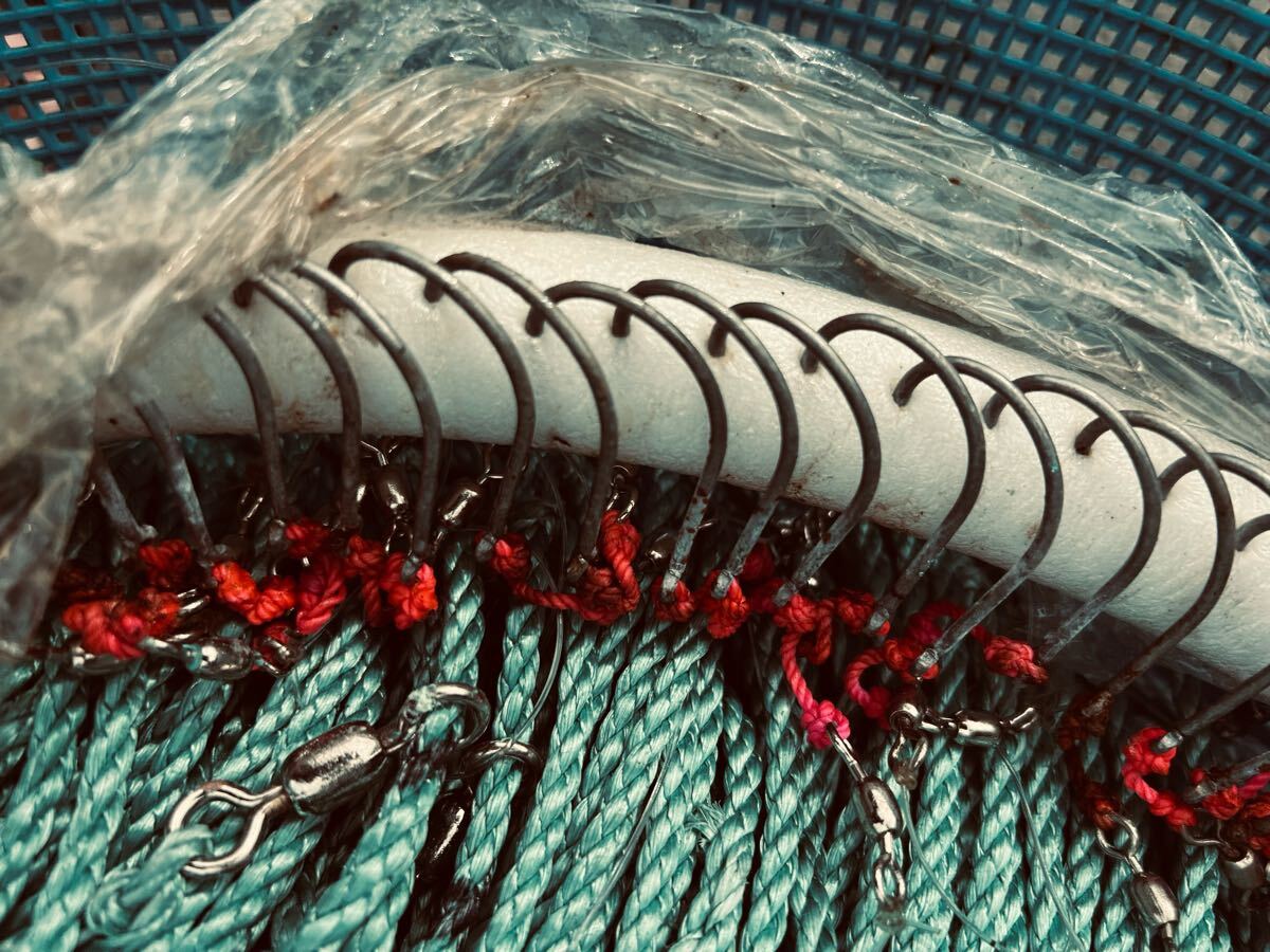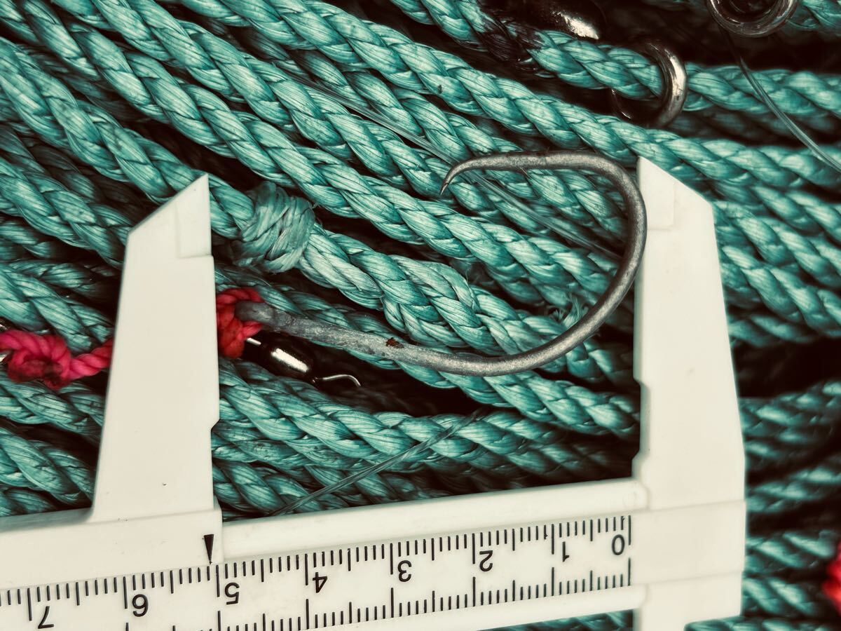 はえ縄上の針の間隔は約5mで大きめのサルカンが付き、そこから2ミリロープと