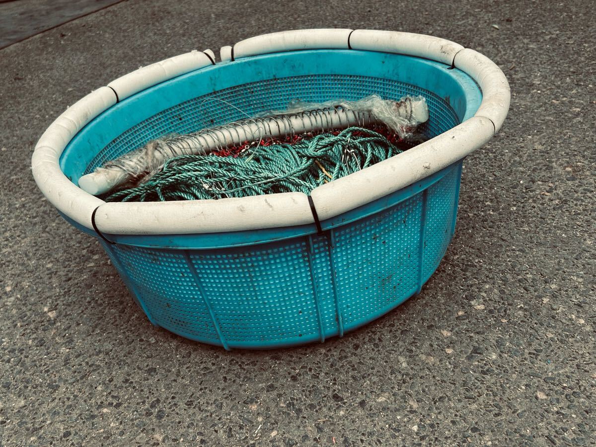 はえ縄入れ物は丸かごサイズ直径55cm高さ22㎝、その上に白の、針受け28ミリ丸発泡が付いております。