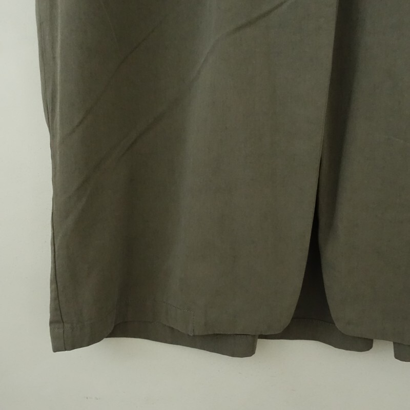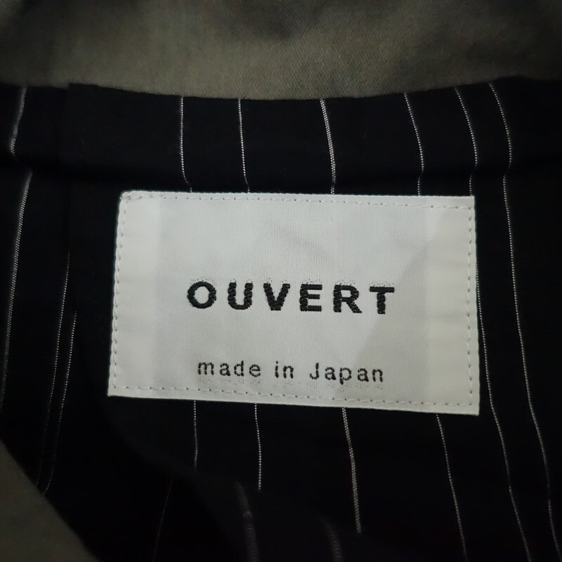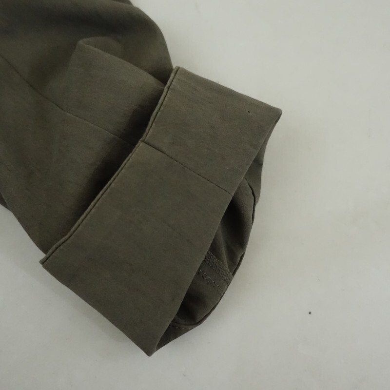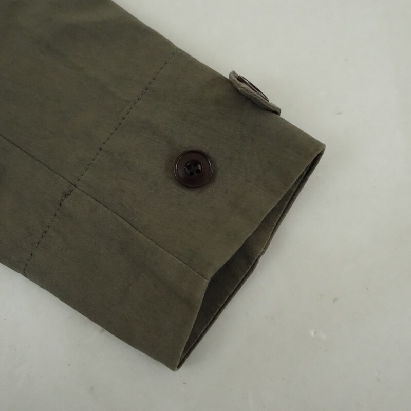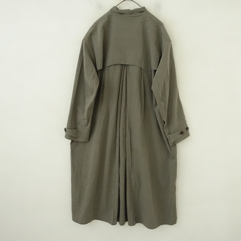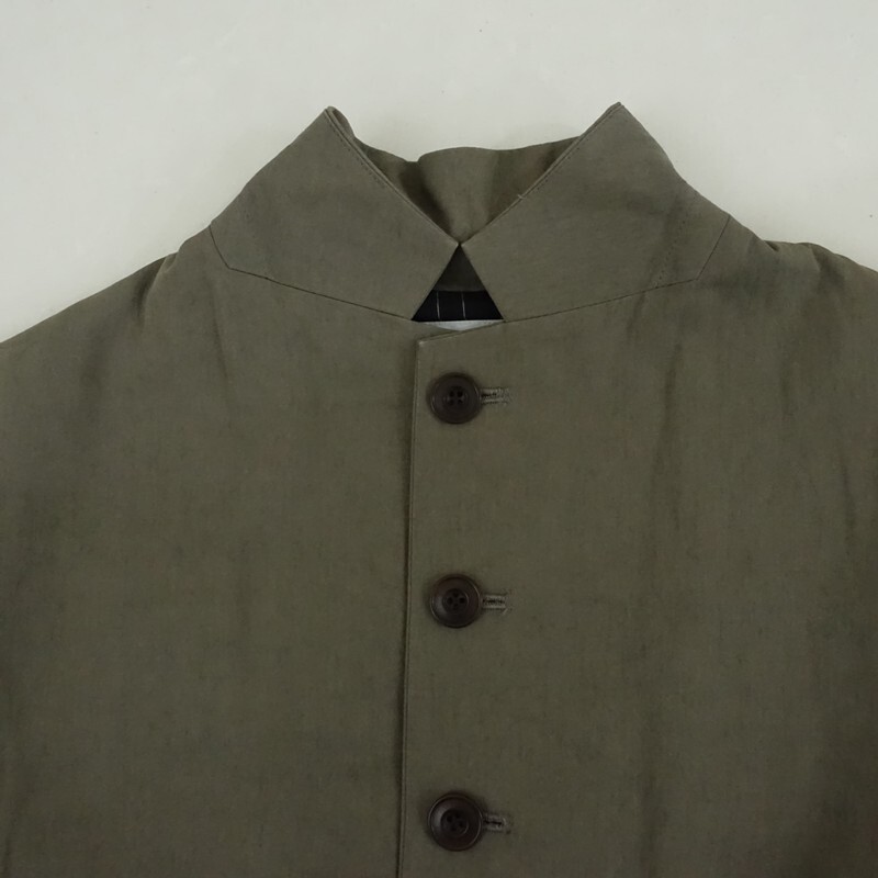 | OUVERTのスタンドカラーステンカラーコートです。カラーはグリーン系カーキで、ややライトなコットン地で仕立てられており、背上部のみ裏地が付いております。アンブレラヨーク付き、ヨーク下にボックスタックが施されており、フロントボタン開閉で着脱できます。パッチポケットが3つ付いております。 |