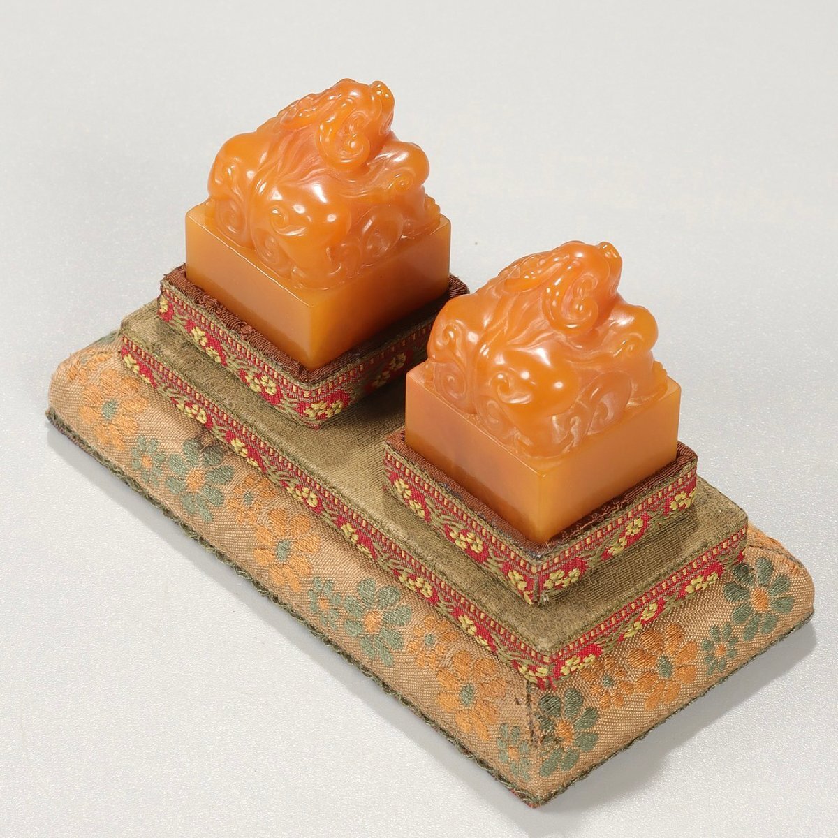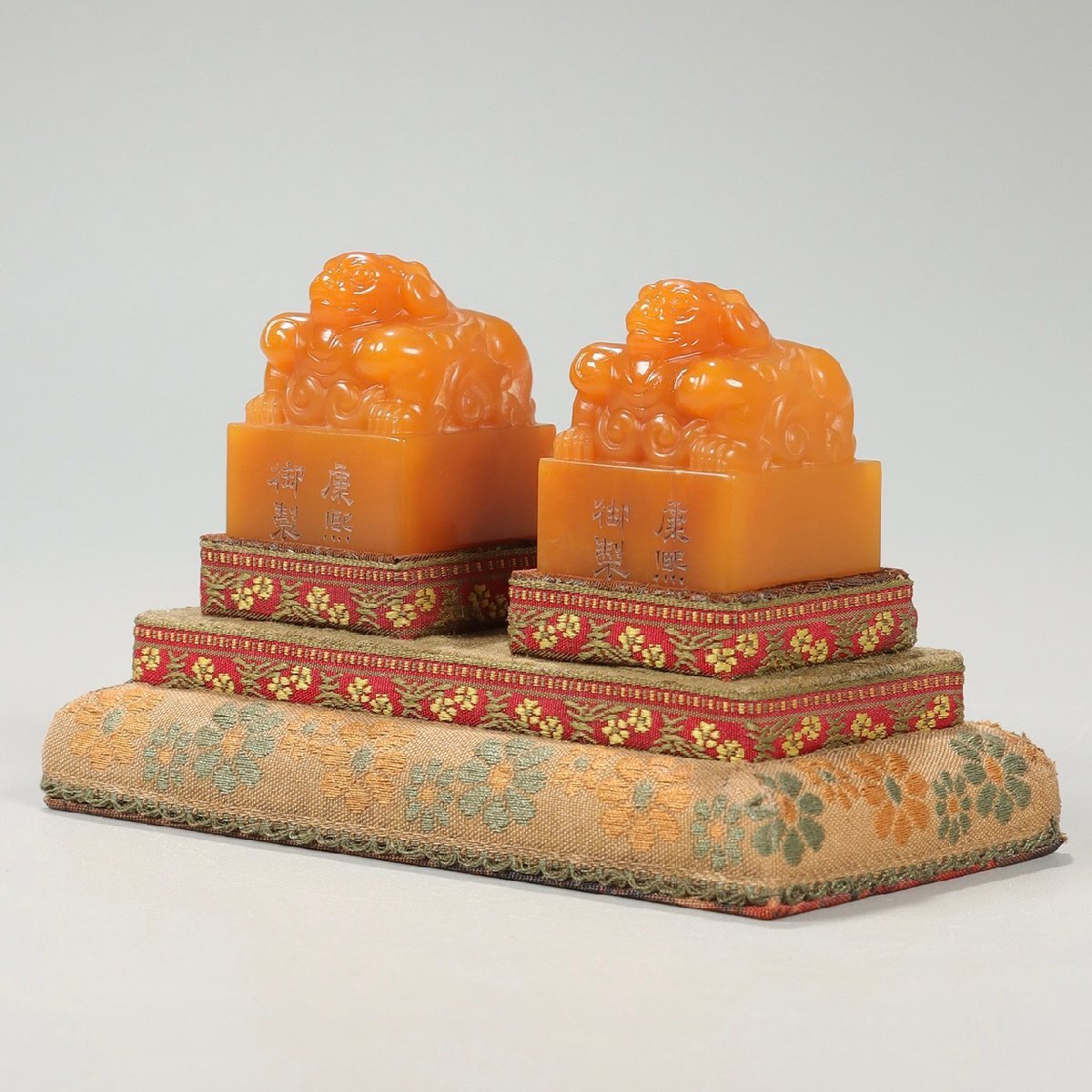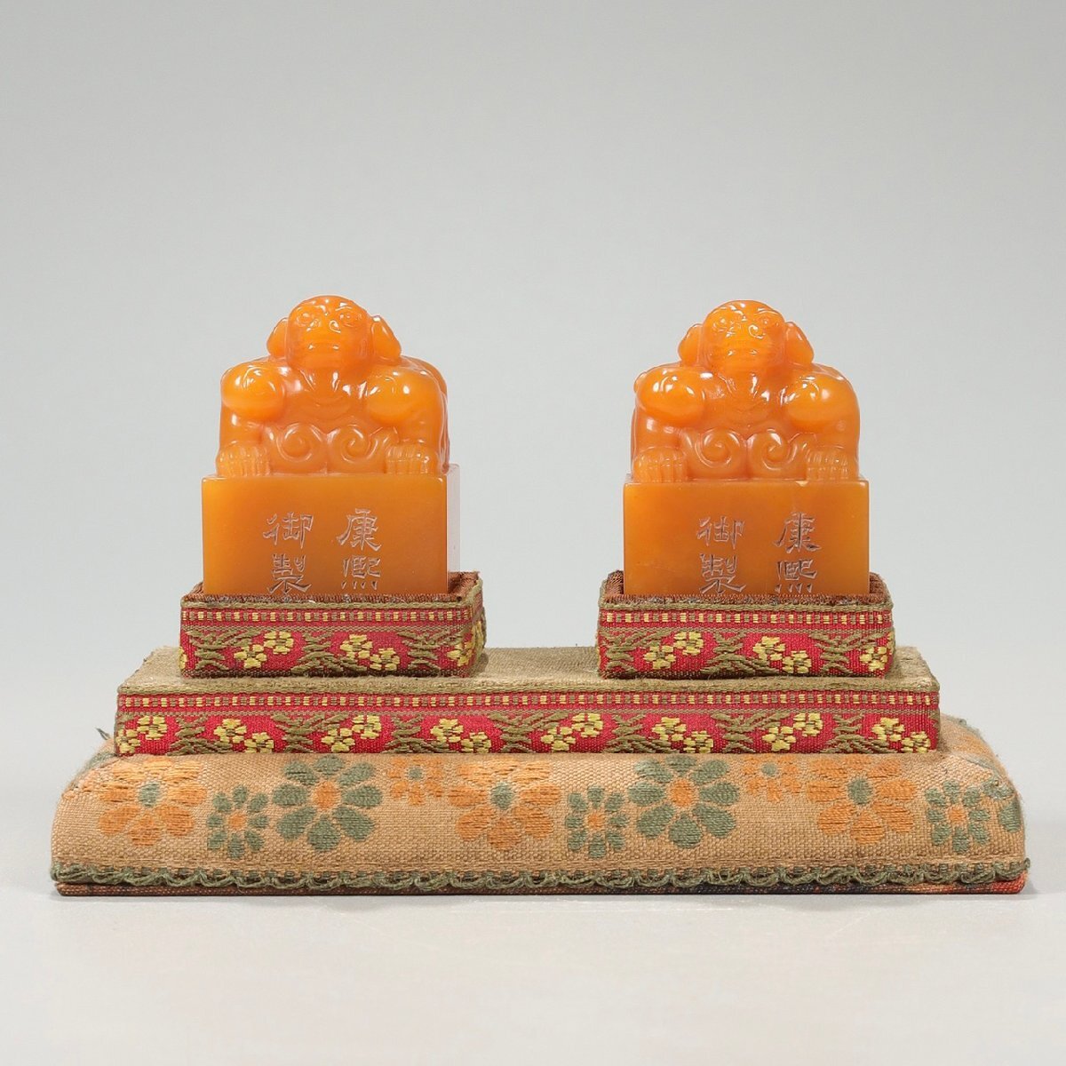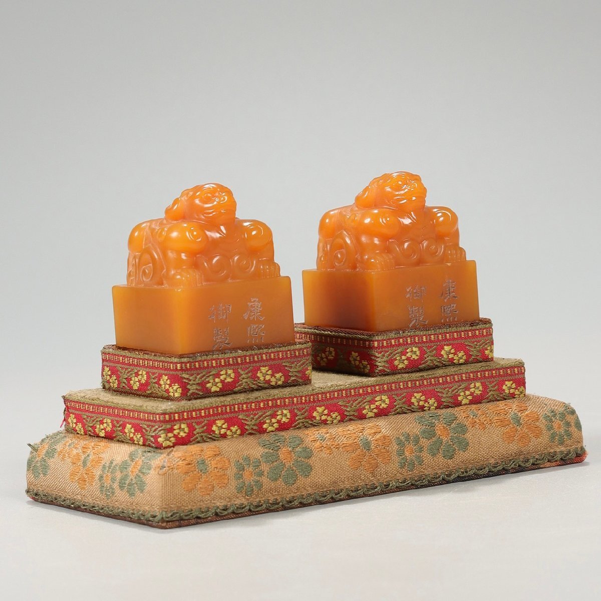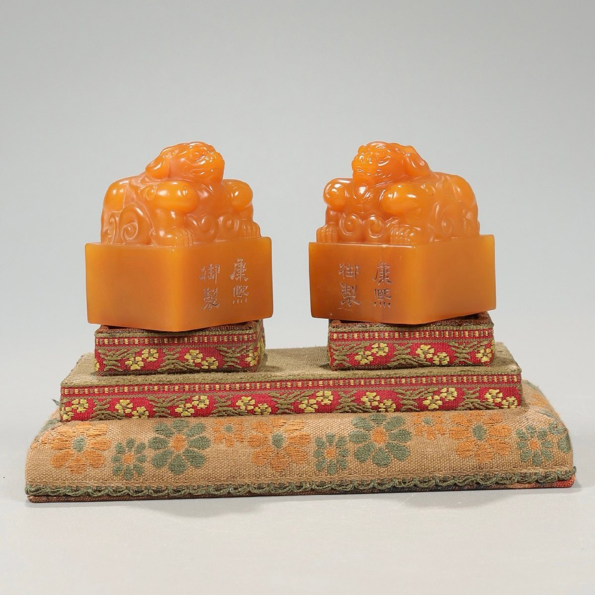 【安】清時代 康熙御製 寿山田黄石彫 瑞獣鈕印章一対 印鑑 共箱 極細工 古置物 古擺件 中国古美術 時代物 189 サイズ(約寸) |