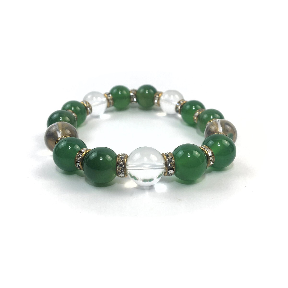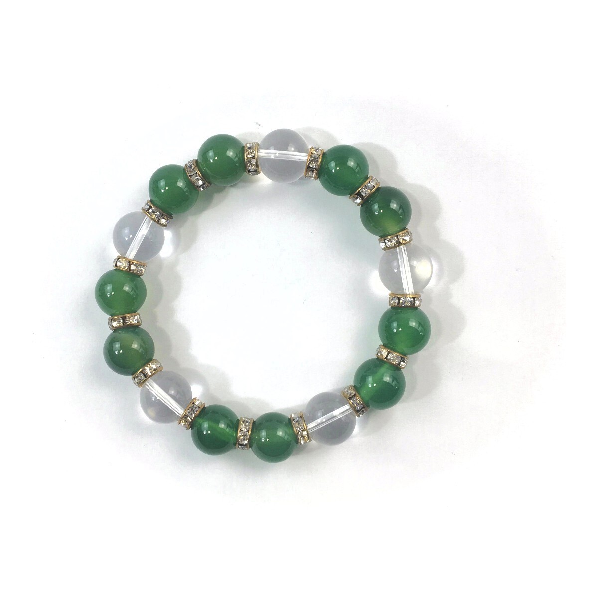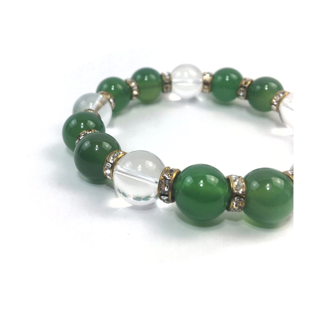こちらは、緑瑪瑙と水晶を組み合わせたパワーストーンブレスレットです。間にはロンデルを挟み高級感あるデザインに仕上げております。石大きさは12mm玉を使用して内径約18cmです。気になる方は是非この機会にどうぞ。