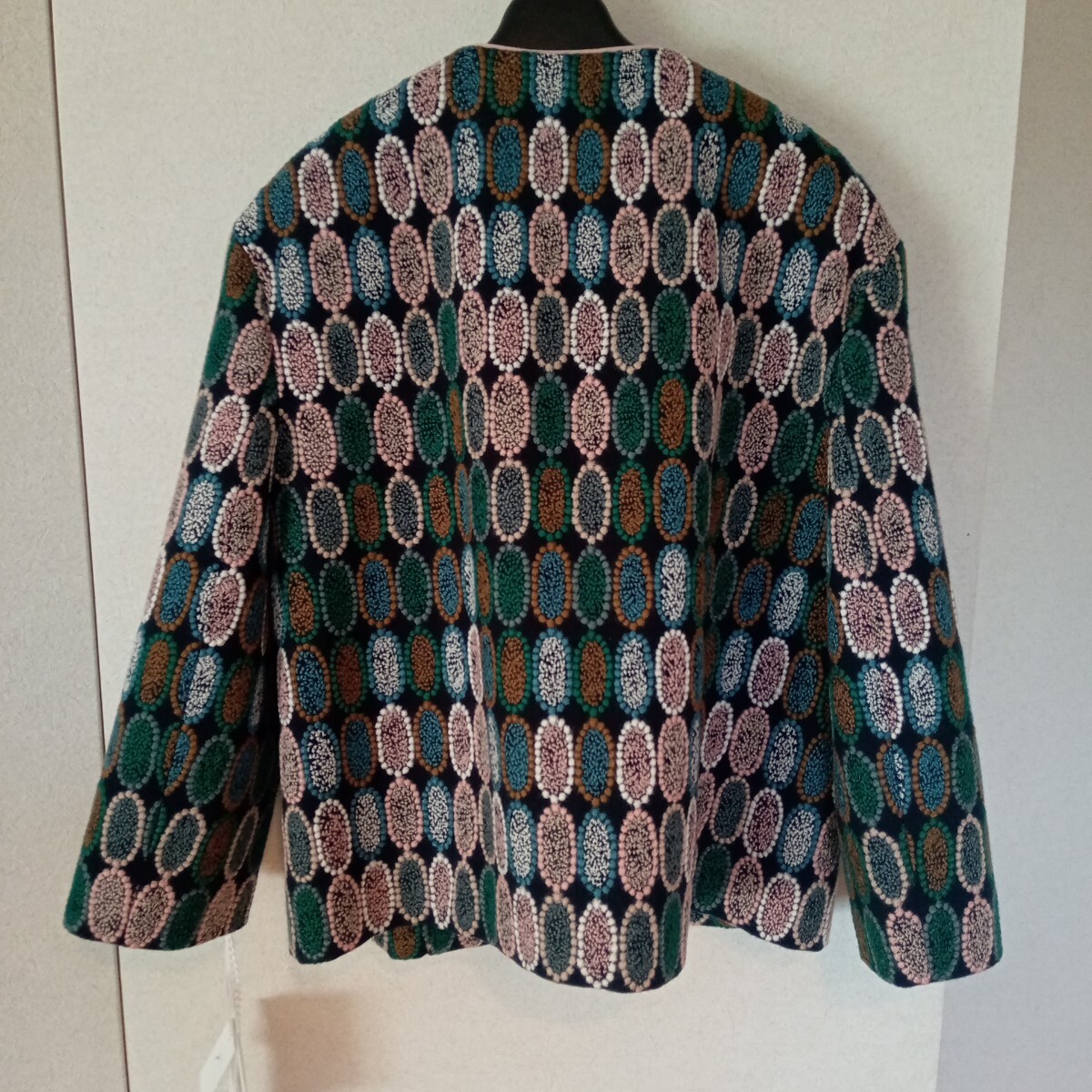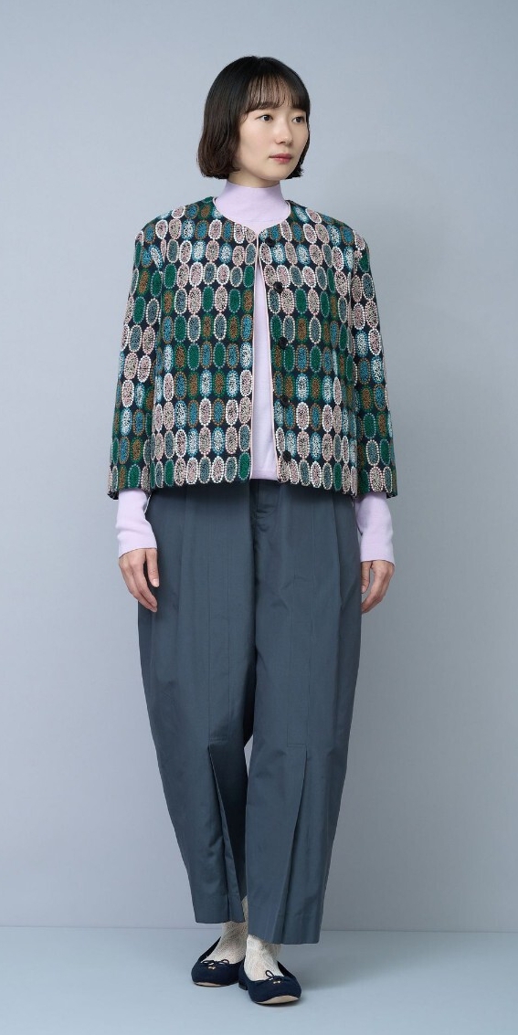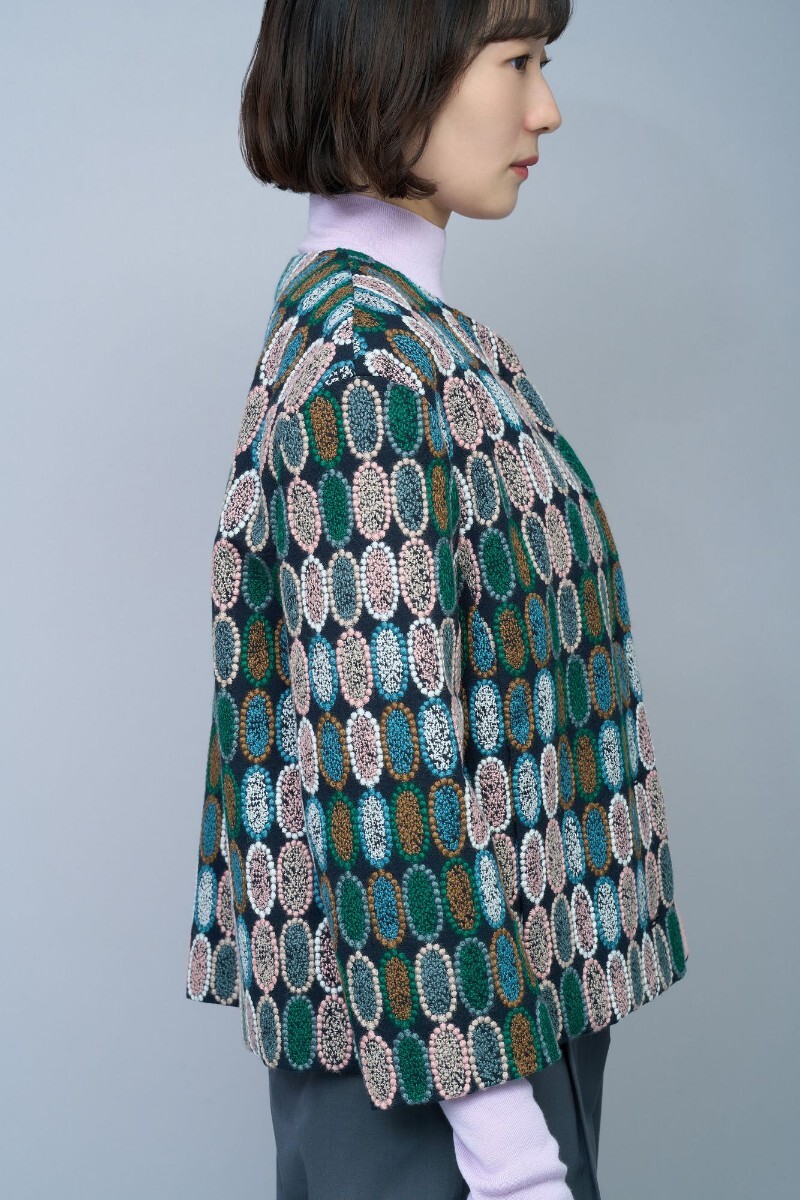 パティスリーに並ぶ色とりどりのタルトをイメージして描いたデザイン“tarte(タルト)”。外側のドットのつながりと、内側のステッチがさまざまなパターンで組み合わさるようにデザインされています。細やかなモチーフひとつひとつに、目を留めたくなるような愛らしさがあり、集まることで一枚の絵のような、華やかな情景が広がります。シンプルなスタイルのジャケット。一枚でコーディネートを華やかに彩る、存在感のある一着です。