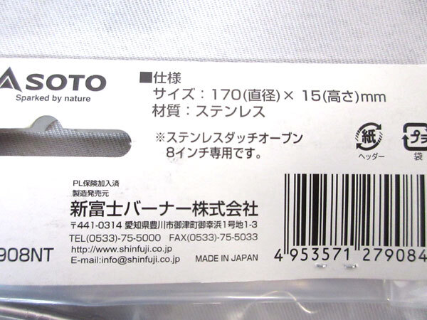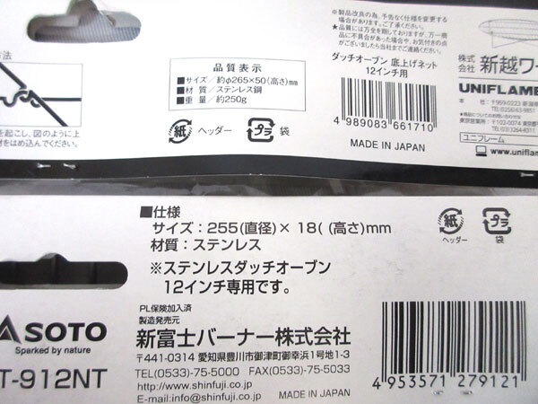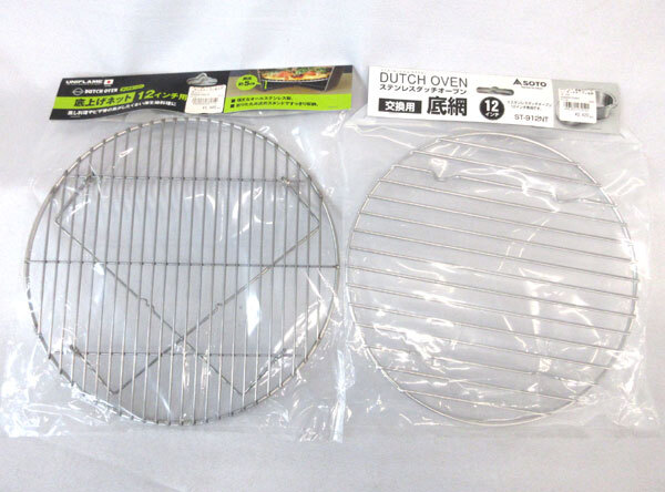 | 内 容 | ■ダッチオーブン専用底網 ■材質:ステンレス ■日本製 ●SOTO 交換用 8インチ×2点 ・サイズ:φ170×H15mm ・重量:135g ●SOTO 交換用 12インチ×1点 ・サイズ:φ255×H18mm ・重量:260g ●ユニフレーム 底上げネット 12インチ用×1点 ・サイズ:約φ265×H50mm ・重量:約250g ◆総額 7840円相当 |