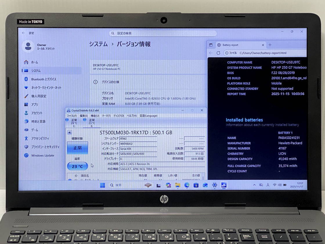 第8世代Core i5 HP 250 G7 Core i5 8265U 1.6GHz/8GB/M.2SSD128GB+HDD500GB DVDスーパーマルチ/WiFi/15.6FHD/WebCam/WIN11 |