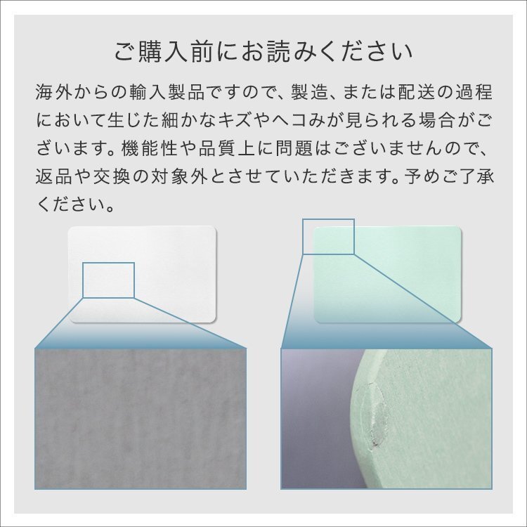 ・海外からの輸入製品となりますので、製造、または配送の過程において生じた、端部分の欠け、細かなキズやへこみが見られる場合がございますが、機能性や品質上に問題はないため、返品や交換の対象とはなりません。予めご了承の上、ご購入をお願いいたします。