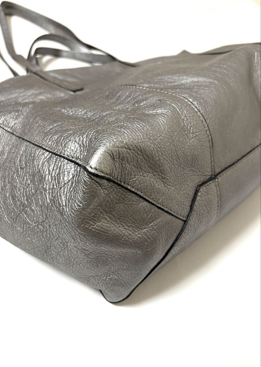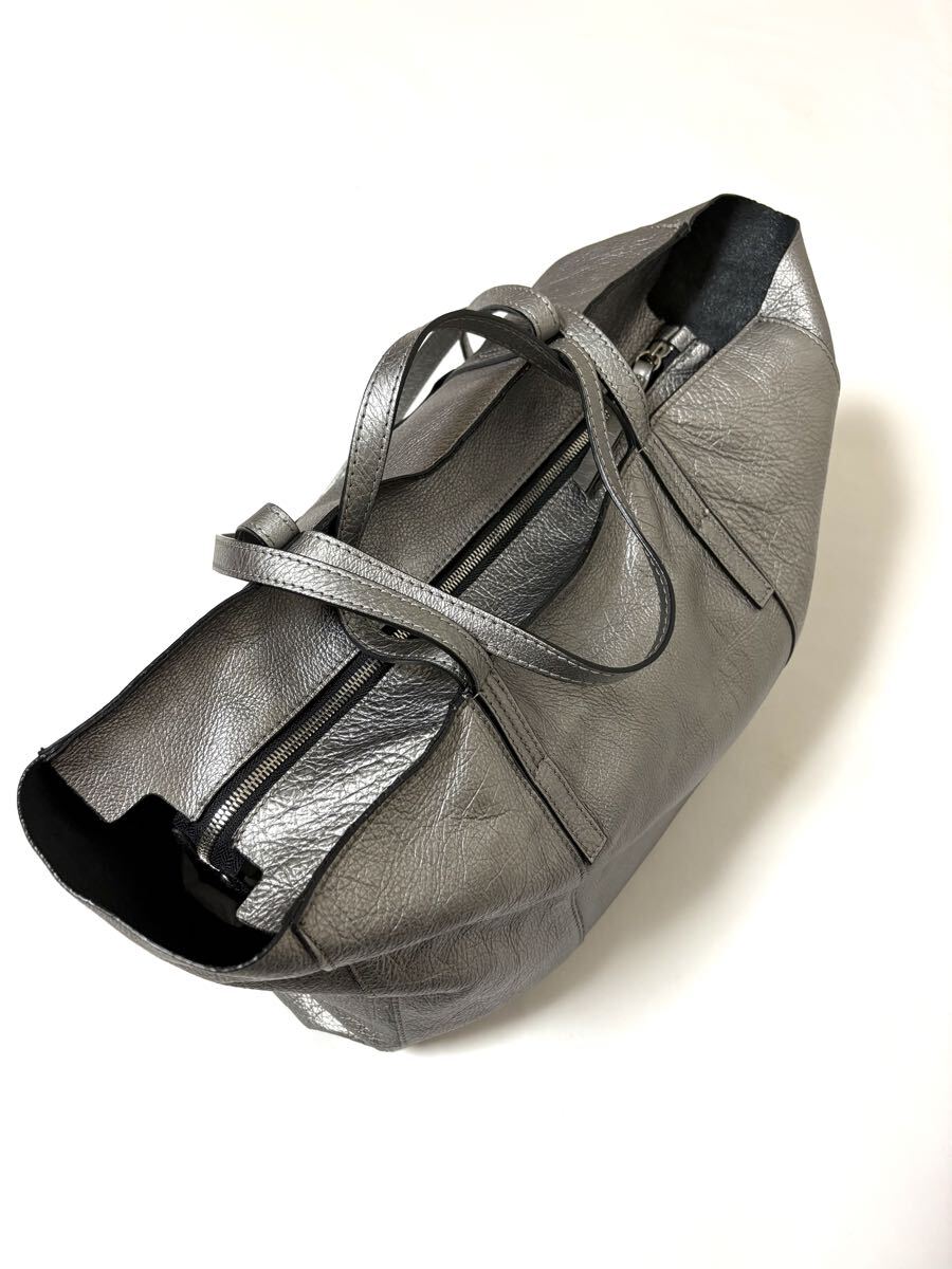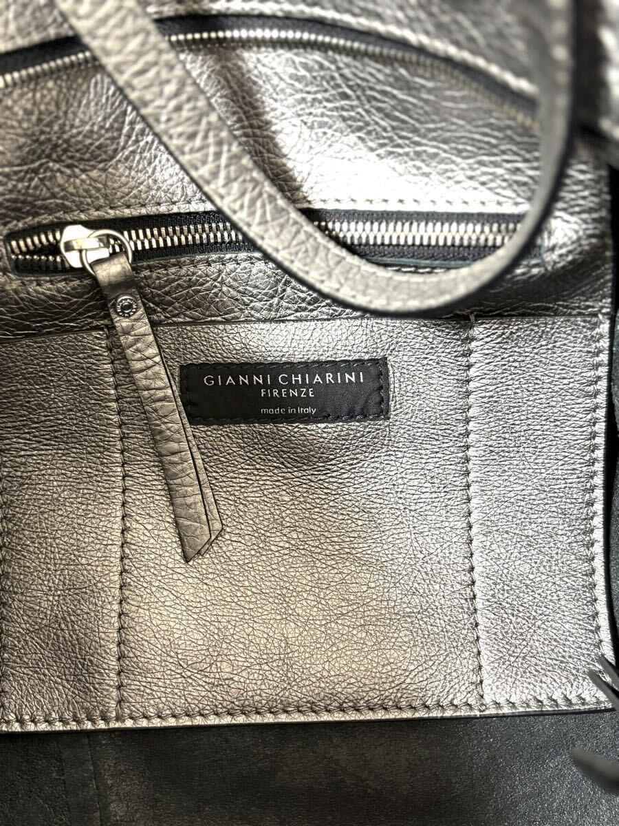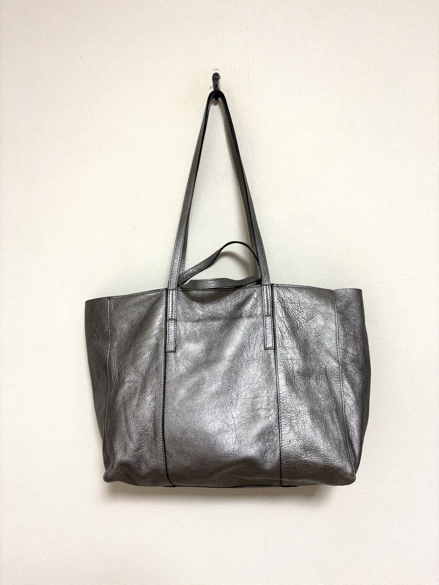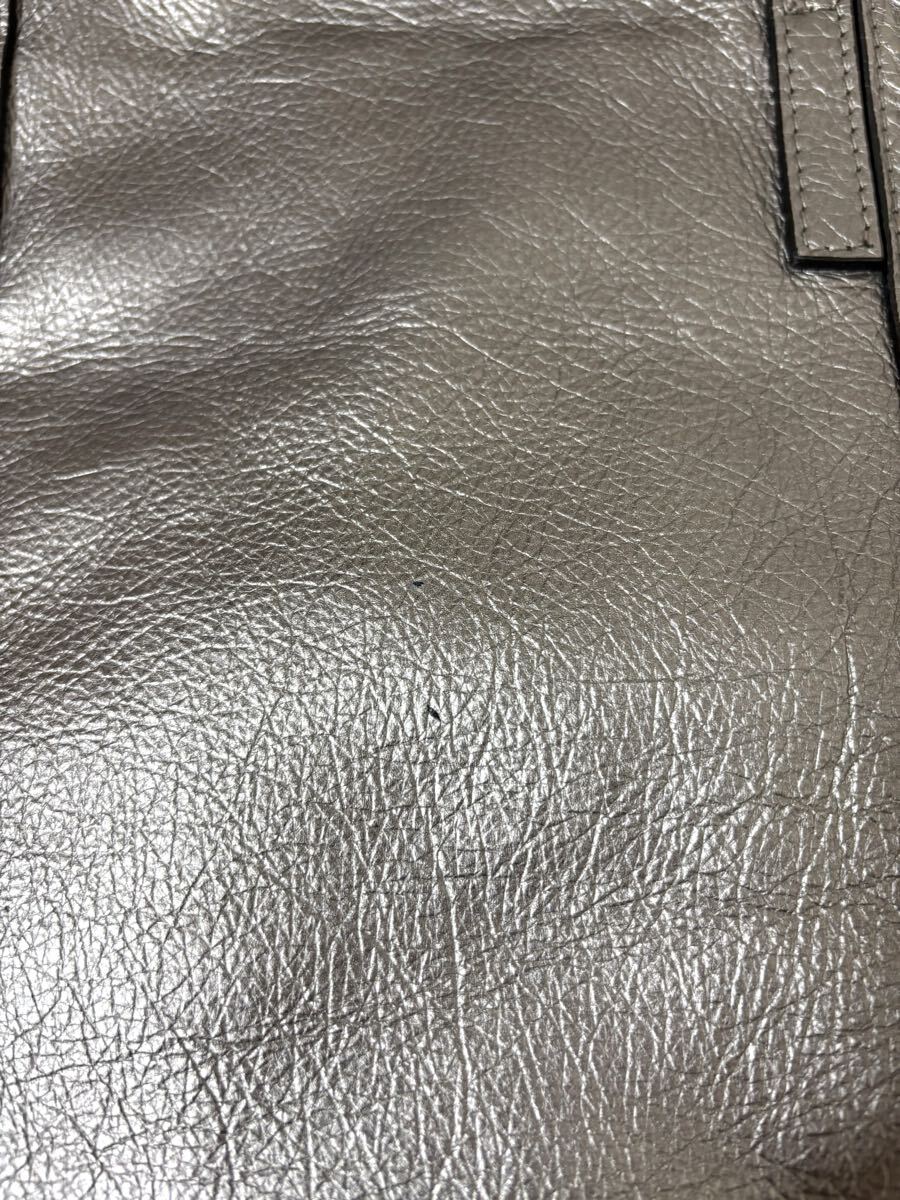 「GIANNI CHIARINI ジャンニ キアリーニ」の2WAYバッグです。サイズ・・・縦約30cm、横約53cm(口部分)~約40cm(底部分)、マチ約15cm。素材・・・レザー。カラー・・・メタリックグレー。イタリア製。メタリックカラーが目を引くトートバッグです。軽く、しっかりと収納できるサイズ感で、お仕事用にもおすすめです。オールシーズン活躍するシンプルなデザインとカラーです。気に入って使用していましたので、細かな傷やよれ、くたり感やしわなどがあります。内側の擦れなどもあります(それぞれ写真でご確認ください)。目立つダメージはないですが、あくまでユーズドですので、神経質な方はご遠慮ください。保存袋等はありません。よろしくお願いいたします。