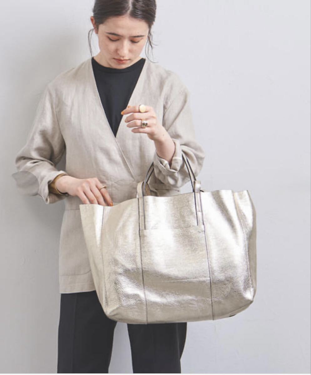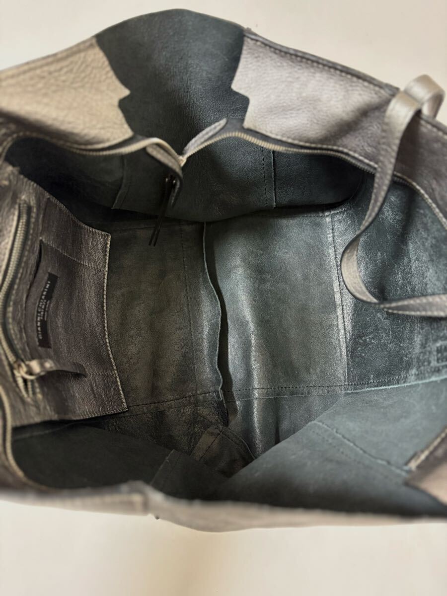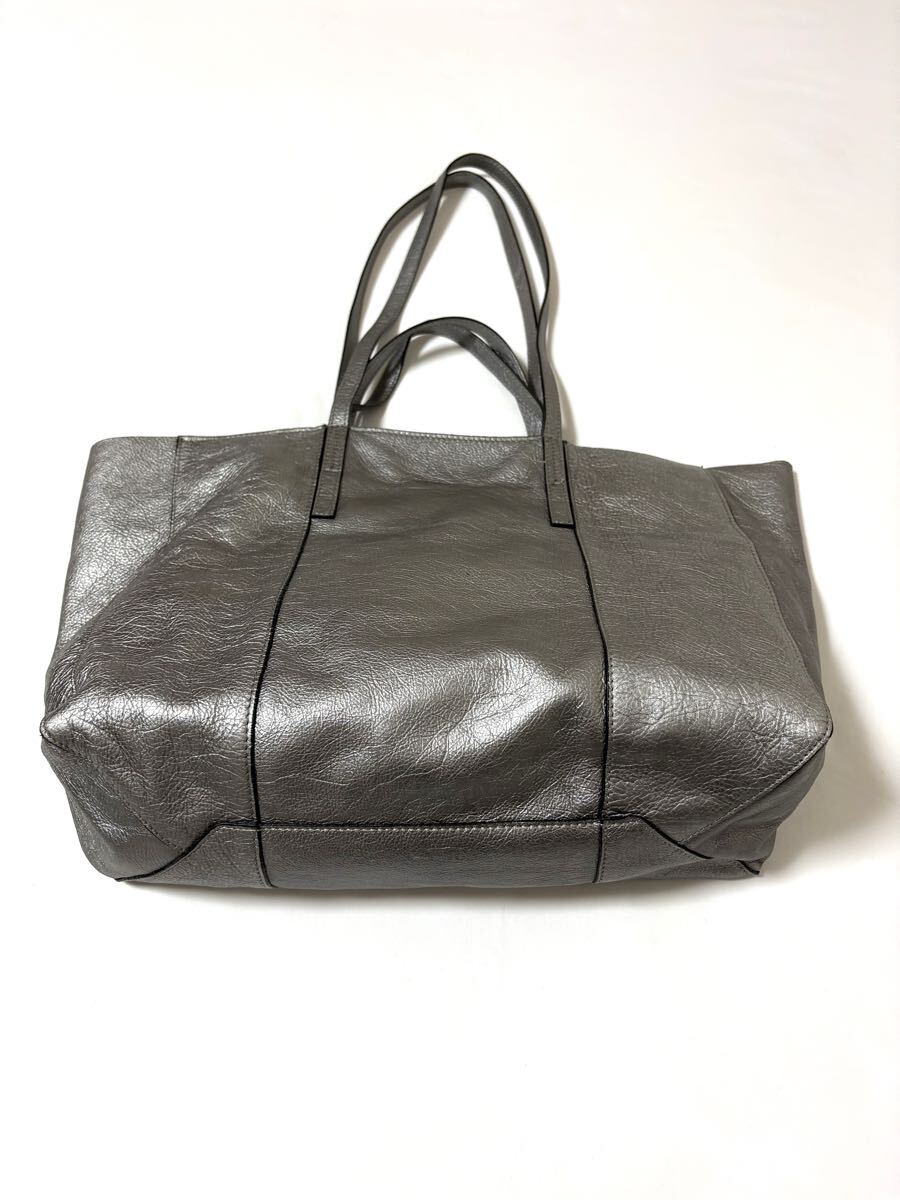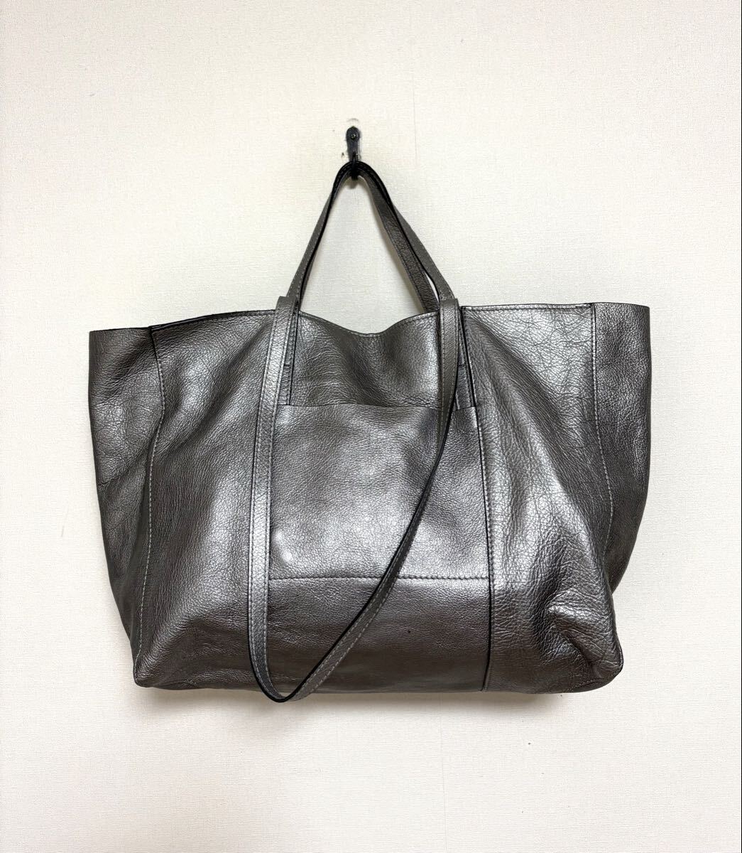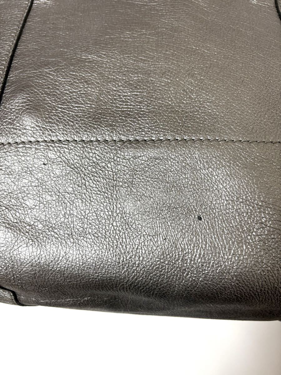 「GIANNI CHIARINI ジャンニ キアリーニ」の2WAYバッグです。サイズ・・・縦約30cm、横約53cm(口部分)~約40cm(底部分)、マチ約15cm。素材・・・レザー。カラー・・・メタリックグレー。イタリア製。メタリックカラーが目を引くトートバッグです。軽く、しっかりと収納できるサイズ感で、お仕事用にもおすすめです。オールシーズン活躍するシンプルなデザインとカラーです。気に入って使用していましたので、細かな傷やよれ、くたり感やしわなどがあります。内側の擦れなどもあります(それぞれ写真でご確認ください)。目立つダメージはないですが、あくまでユーズドですので、神経質な方はご遠慮ください。保存袋等はありません。よろしくお願いいたします。