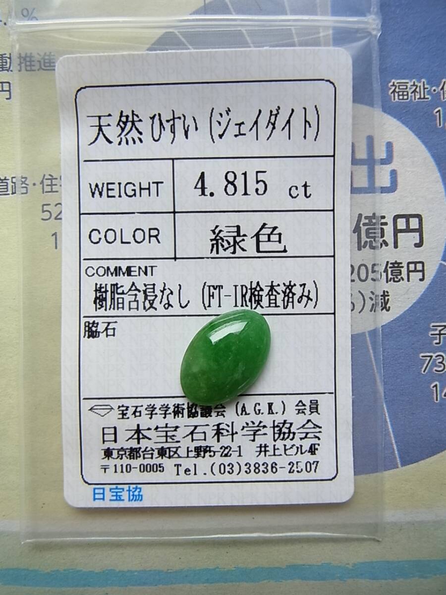 天然 翡翠 ルース 4.815ct ソーティング付 樹脂含浸なし   検索 指輪 リング ソーティング 鑑別書